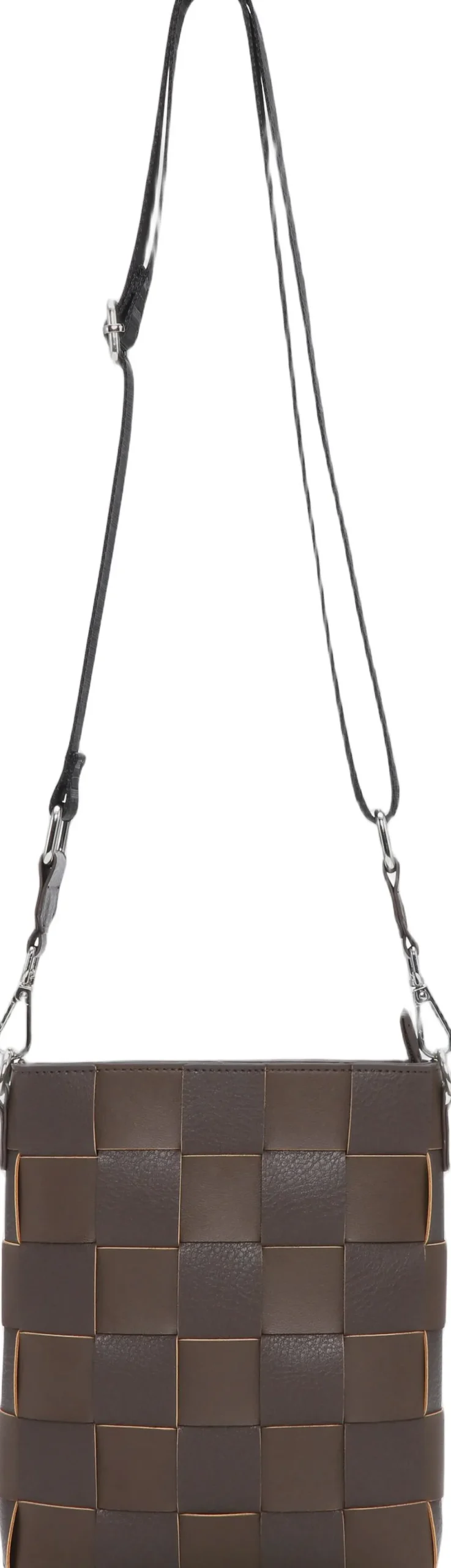 Lille crossbody-taske i rektangulært flettet kunstlæder. Tasken har