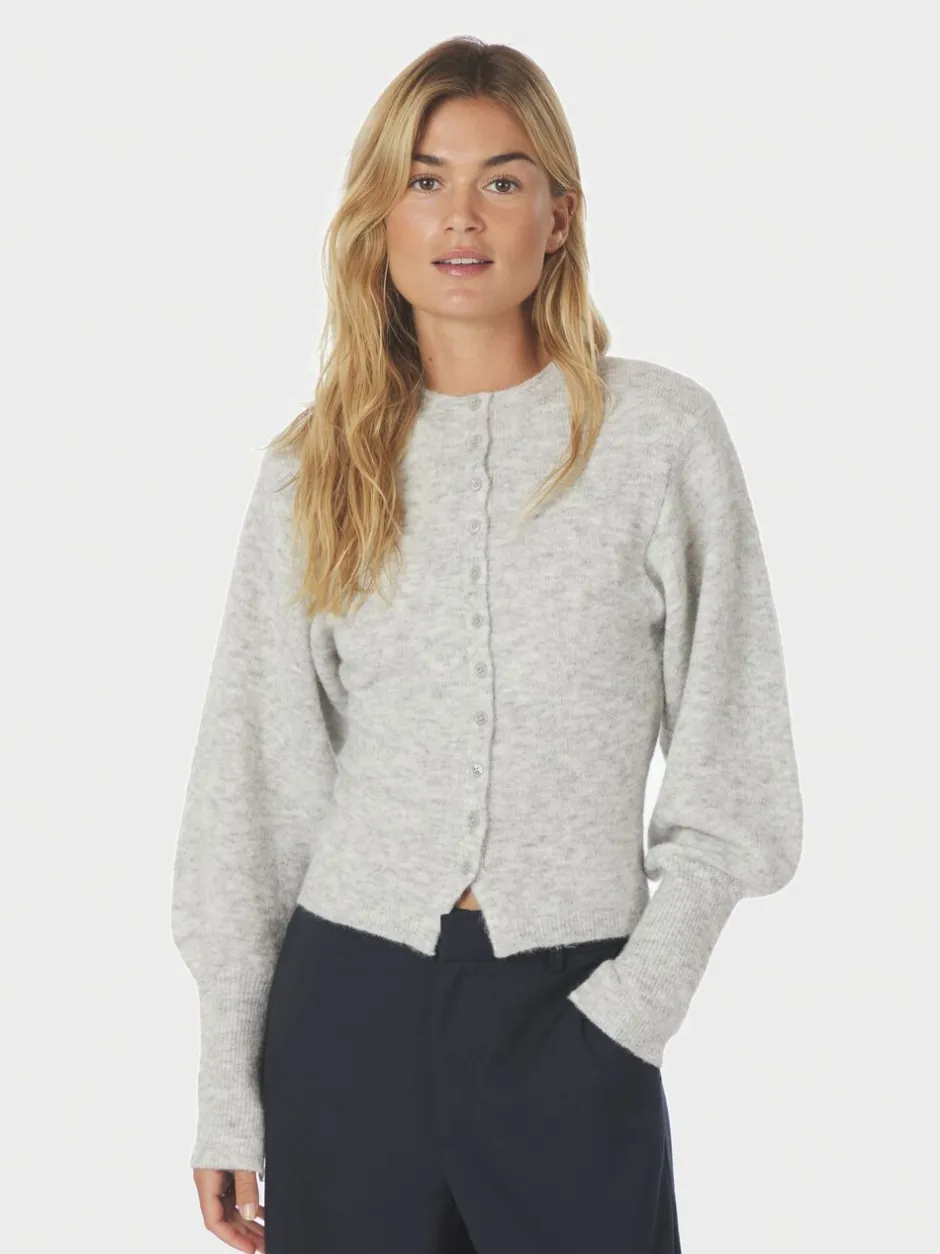 Strikket cardigan med lange ærmer. Cardiganen har en rund halsudskæring, ballonærmer med tætsiddende manchetter og lukkes med knapper langs fronten. Den har en lille slids foran. Materialet er en blød uldblanding, og den har en tætsiddende pasform. Modellen er iført størrelse 36.
