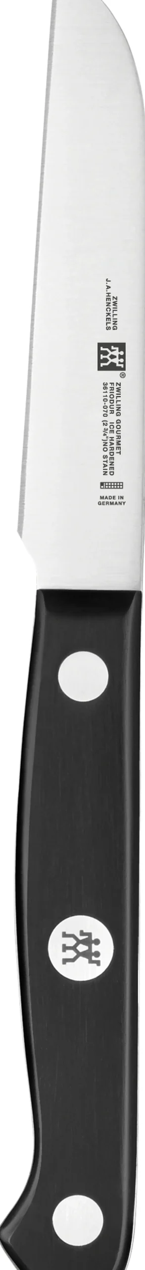 8 cm ZWILLING® GOURMET urtekniv. Udover en skarp klinge har kniven et stabilt greb, der ligger godt i hånden. En god robust knive med en optimal balance. En kniv med et klassisk skaft i sort knuststof med 3 nitter.