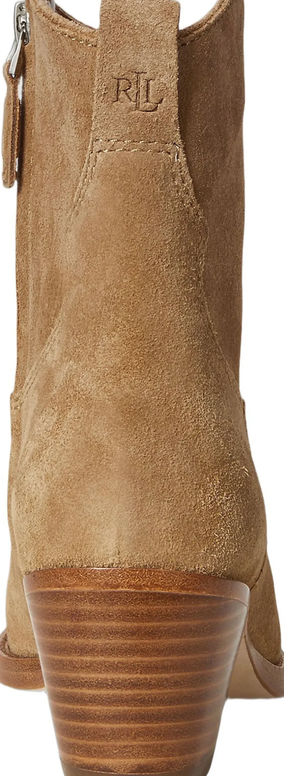 Den western-inspirerede Harper Bootie er fremstillet i fløjlsblødt ruskind og har tonale syninger, en spids tåsilhuet og en 45 mm stablet hæl