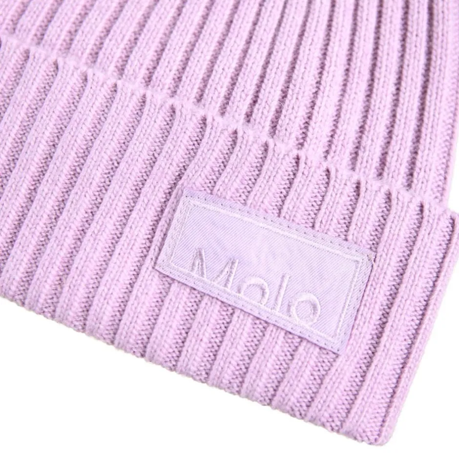 Ribstrikket hue fra Molo med ombuk og Molos logo på fronten.