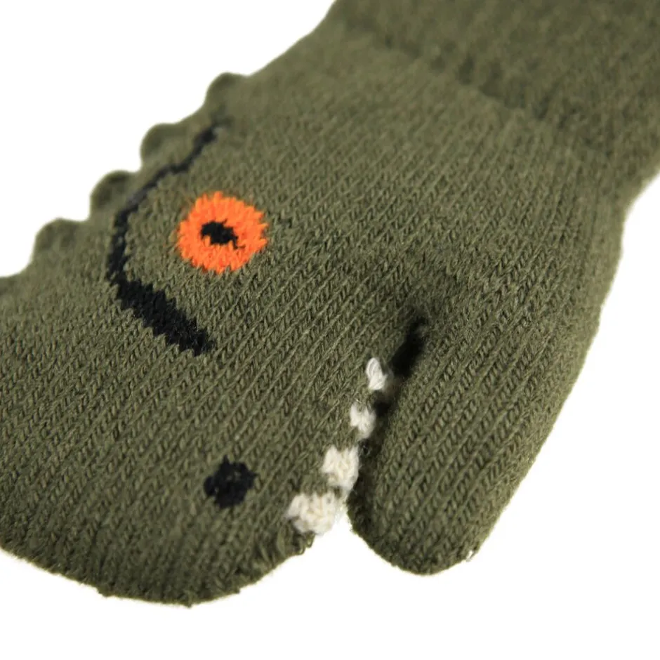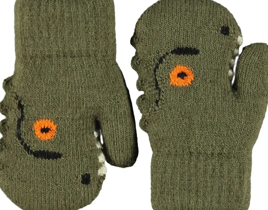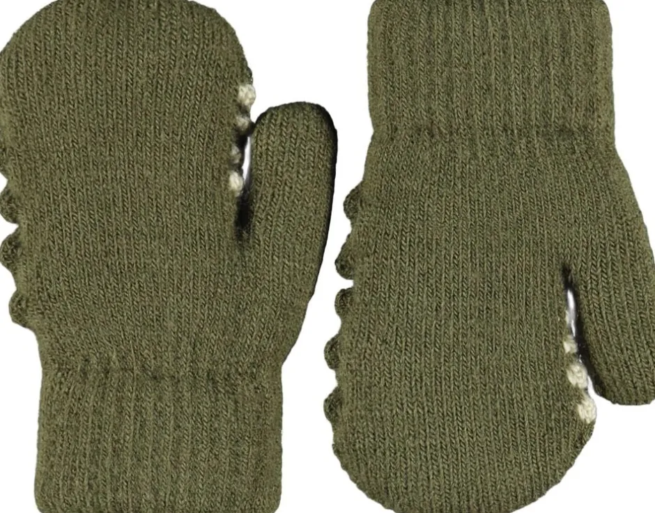 Army grønne strikvanter fra Molo med bamseansigt. Vanterne har en ribkant ved håndleddet og et blødt fleecefor, der holder hænderne varme.