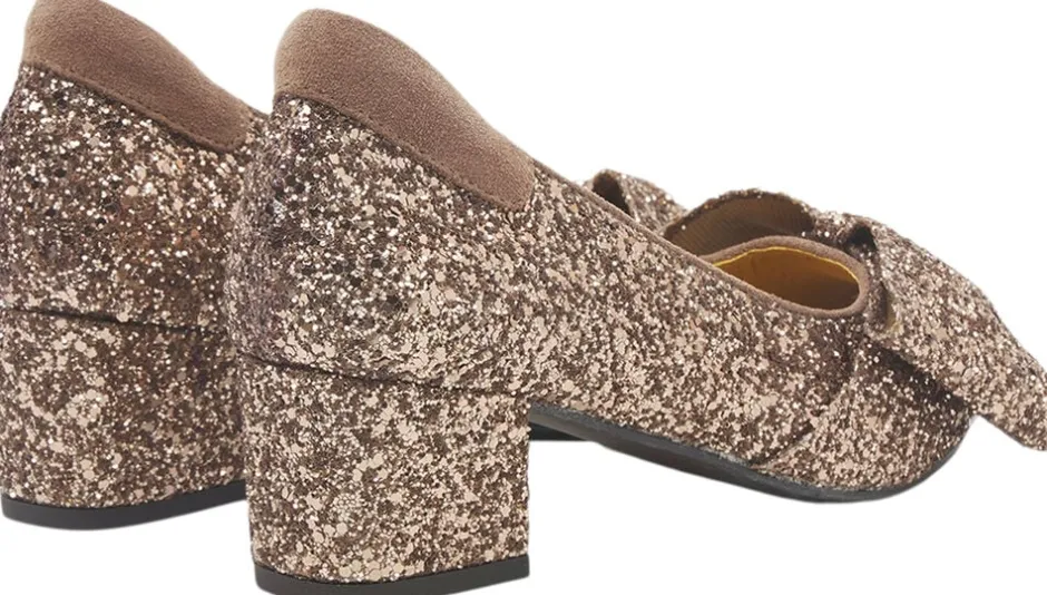 Sløjfepump i funklende glitter. Pumpen har en spids snude, ruskindskanter, polstret krave for ekstra komfort og støtte, vatteret indersål, læderfoer, sort tunitsål og en