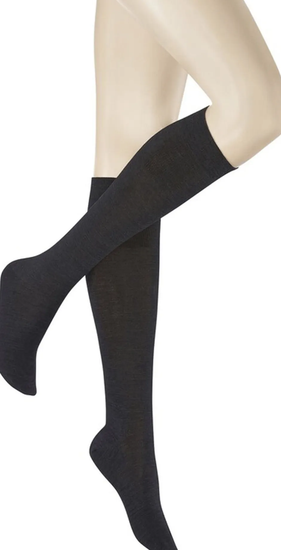 Knæstrømper fra Kunert i en let og lækker blanding af merinould og bomuld. Strømpen er enkel i modellen med en slidstærk hæl og tå samt en ribstrikket elastikkant. Et par skønne strømper i en blød kvalitet.