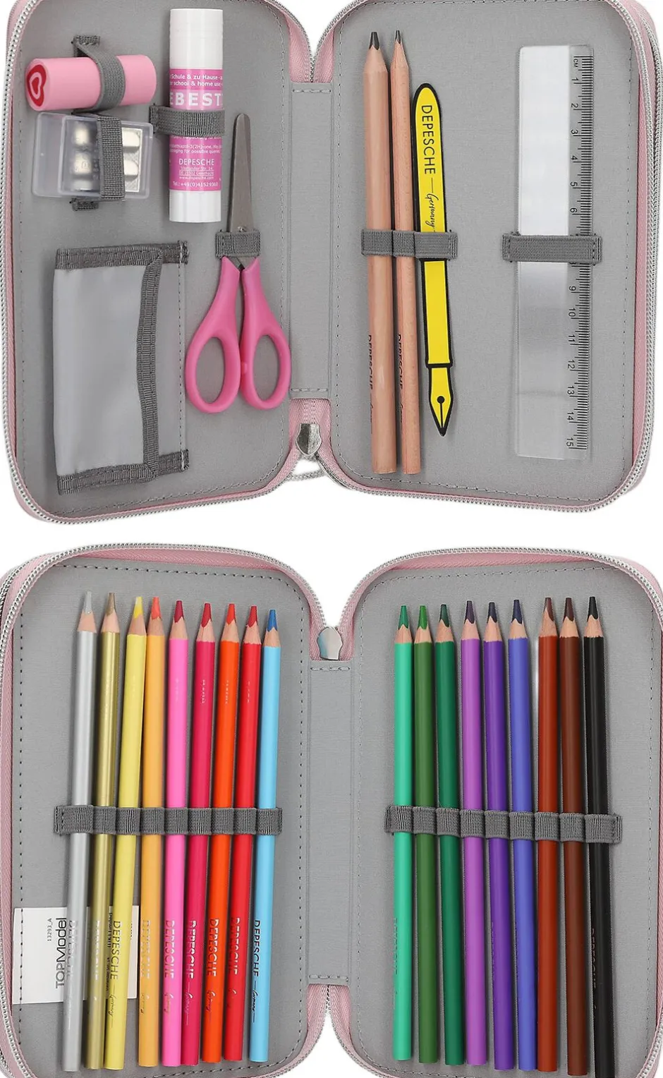 Super sødt penalhus i rosa og grå fra TOPModel serien MY BFF har et flot motiv af TOPModellen Candy på forsiden på en glitrende metallisk baggrund og med en sto r, glitrende sløjfe som sødt lynlåsvedhæng Penalhuset er opdelt i to separate rum og indeholder 2 blyanter, 1 blyantspidser, 1 viskelæder, 1 lineal, 1 saks, 1 l imstift og 18 farveblyanter Mål: 5 x 12,5 x 20 cm