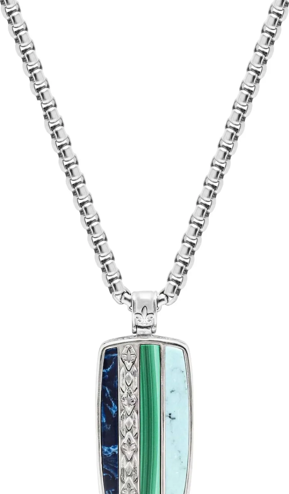 Trinity-vedhængshalskæde til Herre i sølv, vedhæng og kæde i rustfrit stål af høj kvalitet, hundemærke med turkis, malakit og chrysocolla, vedhængsstørrelse: 16 mm x 28 mm, modellen er iført 22″ halskæde. Håndlavet i Los Angeles