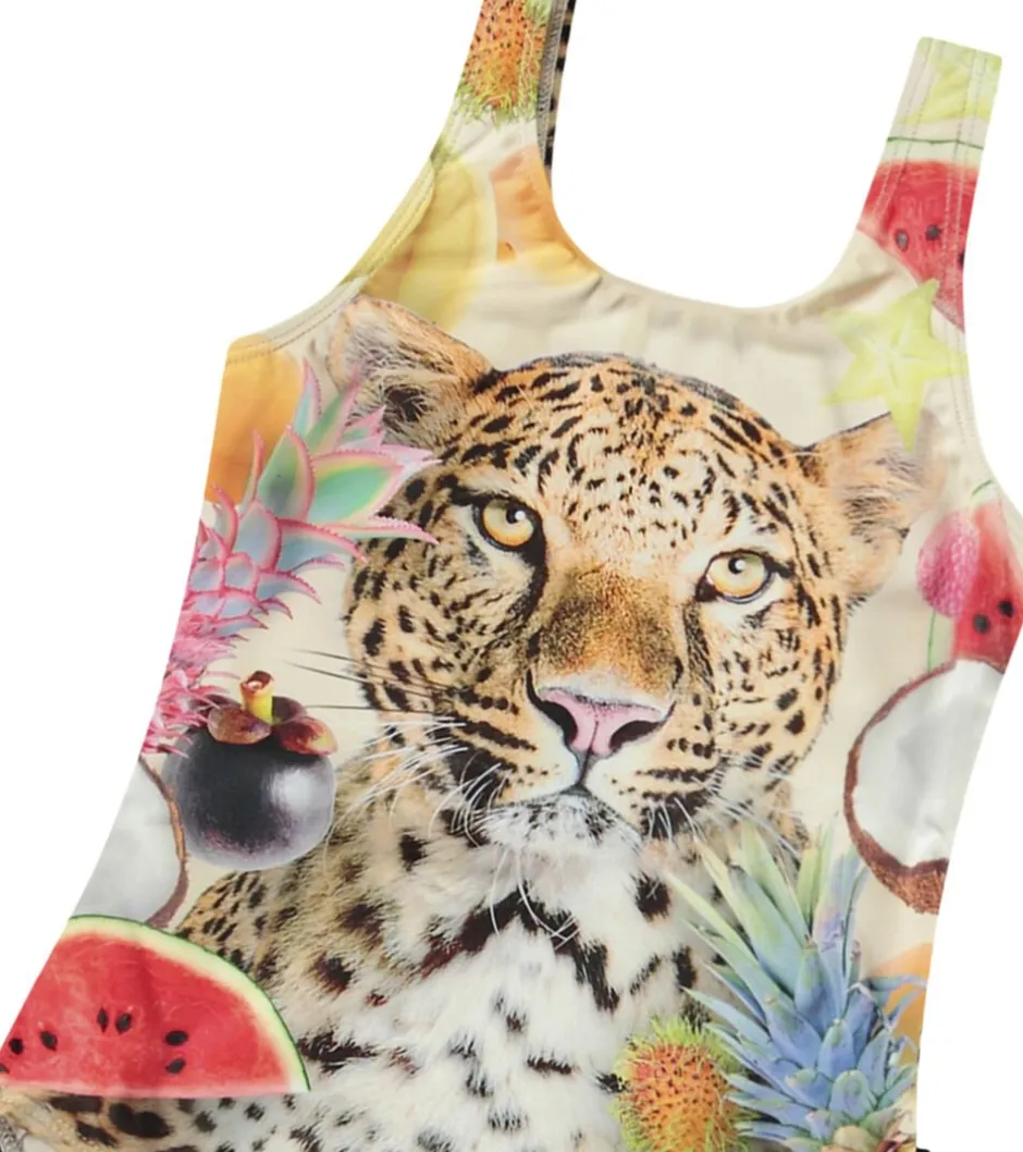 Lyserød badedragt med smilende smiley-print på forsiden. Lavet af genanvendt, elastisk polyester for komfort og nem påklædning. Med en høj UV-beskyttelse på 50+ er den ideel til solbeskyttelse.