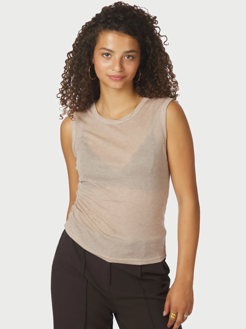 Ærmeløs top i en blød ribkvalitet. Toppen har en rund halsudskæring og en tætsiddende pasform. Den er lavet i en blød lyocell- og uldblanding. Modellen er iført størrelse 36.