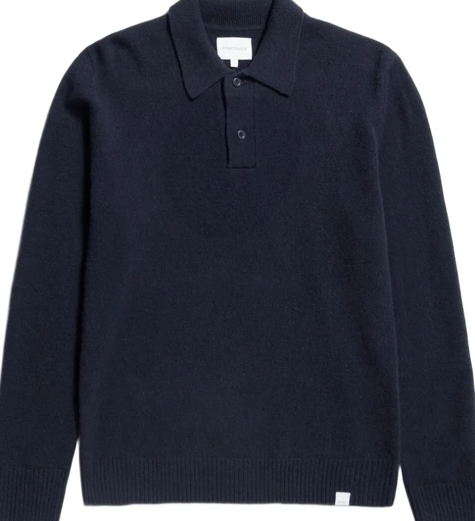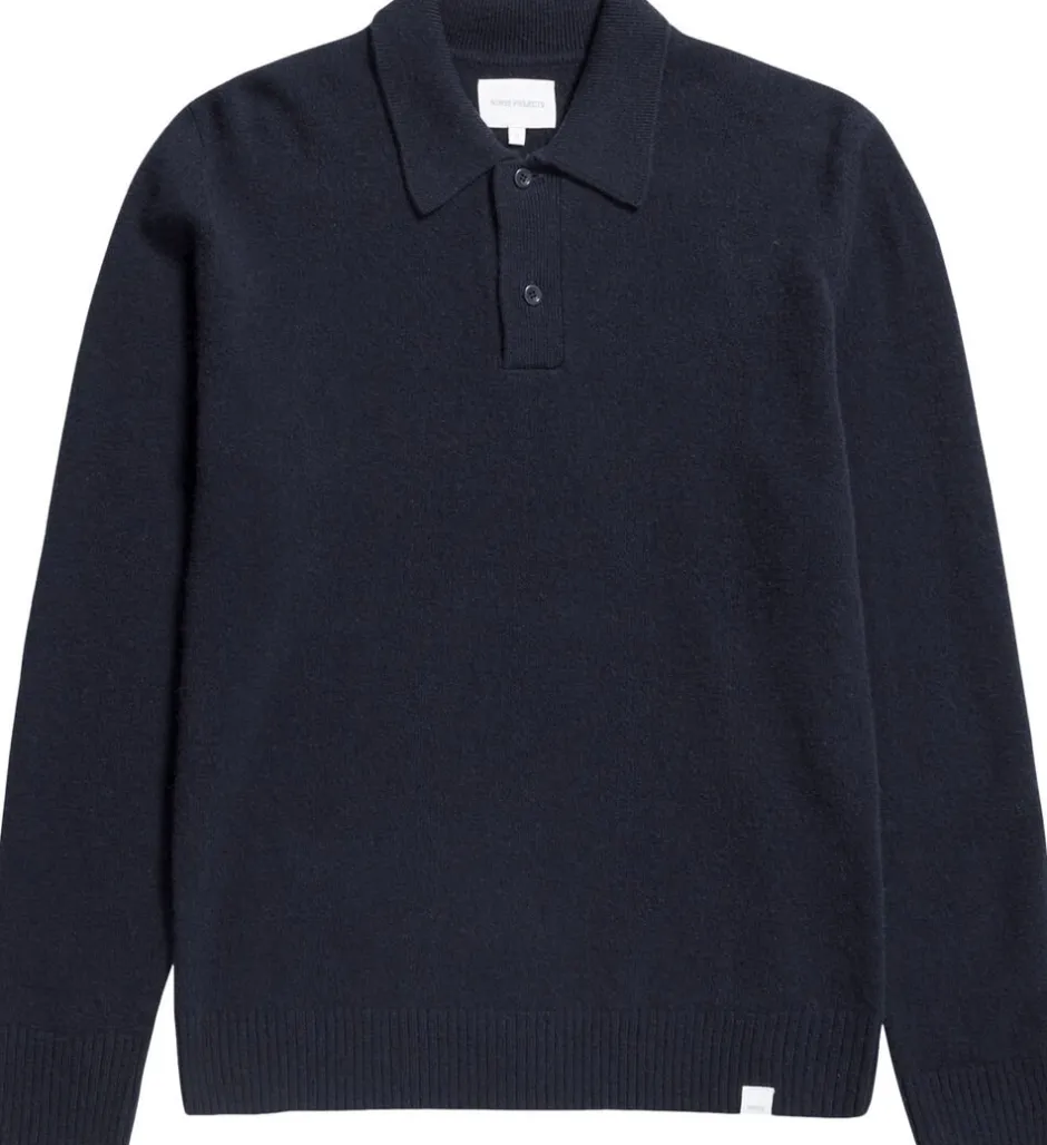 Den nordiske standard Merino Lambswool Polo, der er fremstillet i Italien, har indsatte ærmer, en fuld nålekrave, en stolpelukning med 2 knapper og 2×2 ribkanter ved kanten og manchetterne.