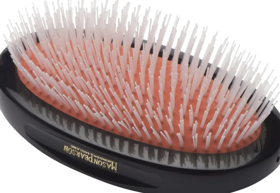 Mason Pearson N2M er den eneste størrelse herrebørste i sortimentet lavet af ren nylon. Mason Pearson børsten i nylon er kun beregnet til udredning af filtret hår og har ikke den samme plejende effekt som de øvrige Mason Pearson børster lavet af ren vildsvinehår eller i et mix af vildsvinehår og nylon. N2M er specifikt designet som en herrebørste, Military style betyder at børsten ikke har et håndtag og er genereltkraftigere og mere maskulin i sit udtryk.