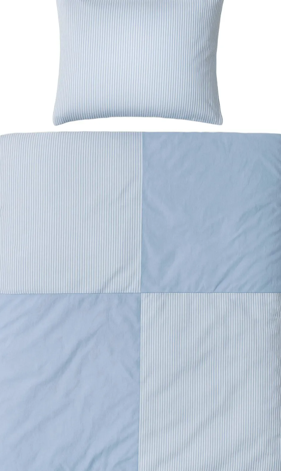 OMHU MINI STRIB PATCHWORK SENGELINNED Sengesættet er fremstillet i en ekstra lækker Renforcé lærredsvævning i 100% økologisk bomuld TC 144. Renforcéen giver en meget glat overflade, der vil gengive farverne meget flot. Sengesættet er designet som patchwork og sammensyet af fire felter på fronten i en kombination af den klassiske smalle strib og meleret Chambre, som også udgør den modsatte side. Dette giver flere kombinationsmuligheder på en flot opredning. Perfekt for dig der ønsker et roligt design og god samvittighed.