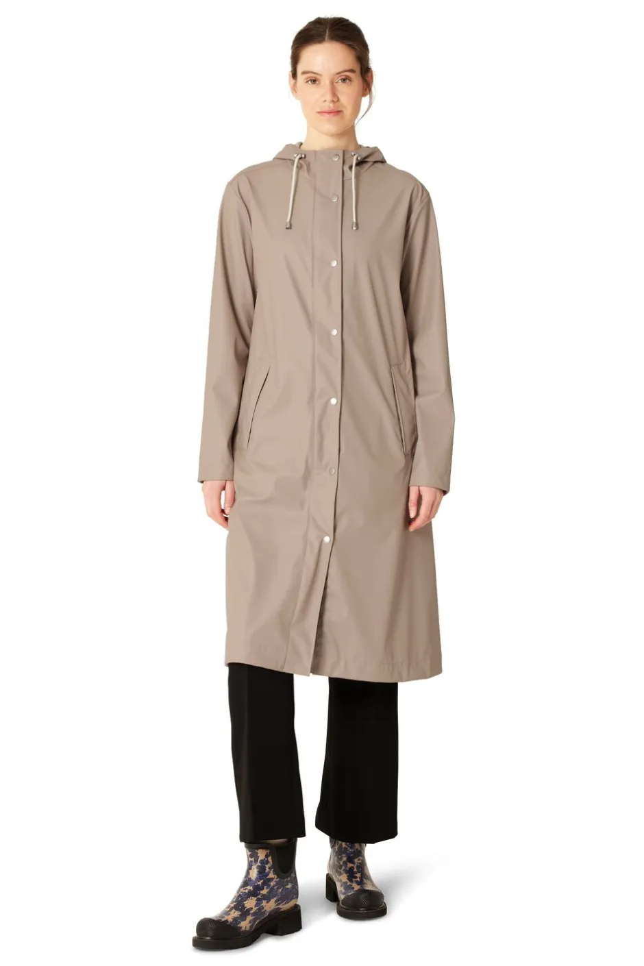 Denne lange A-line regnfrakke er fremstillet af slidstærk gummieret PU-belagt