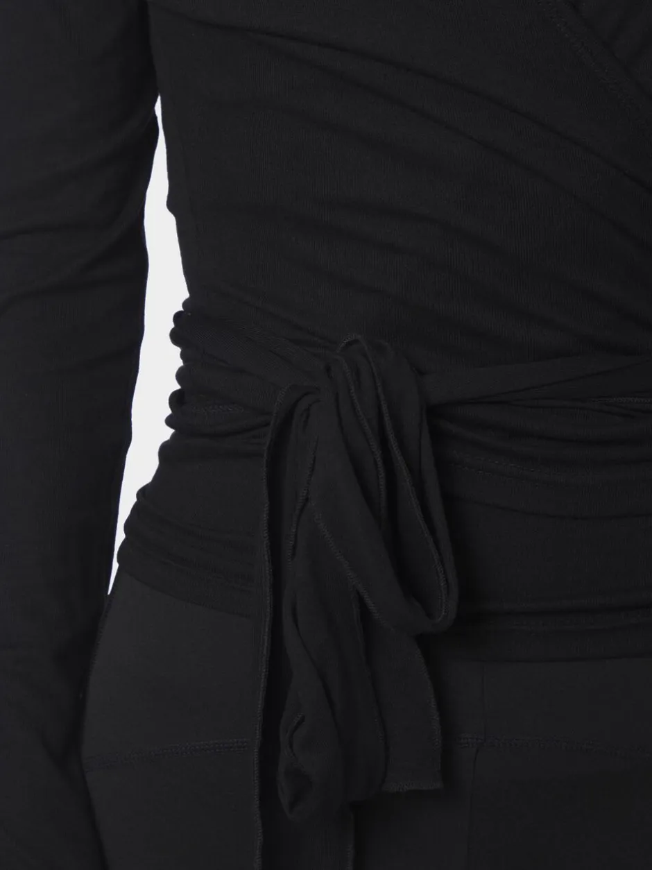 Langærmet bluse med slå-om-effekt. Blusen har en v-halsudskæring, er lavet i en blød kvalitet og har en tætsiddende pasform. Den har et justerbart bindebånd, der kan bindes både foran og bagpå. Modellen er iført størrelse 36.