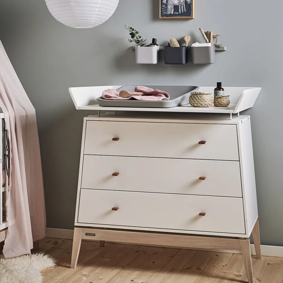 Pusleenheden indbyder til hyggestunder med dit barn. Den er designet med høje kanter, der giver tryghed, når dit barn skal pusles. Samtidig giver den store pusleflade og de tre rummelige skuffer på Leander Luna kommoden god plads til f.eks. Leander Matty puslepuden samt opbevaring af bleer, vand, vaskeklude og tøj.