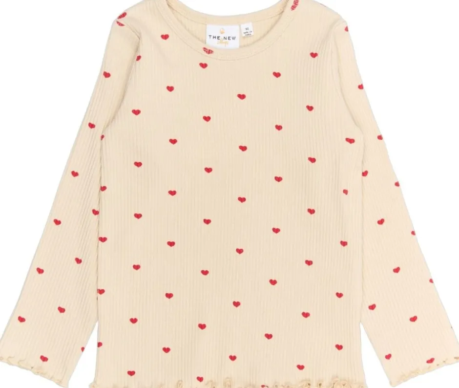 Denne langærmede T-shirt fra THE NEW Siblings er både sød og komfortabel med sit fine all-over print af små hjerter. Den er designet med feminine bølgede kanter ved ærmer og bund, som giver et legende og charmerende udtryk. Den tætsiddende pasform gør den ideel til både hverdagsbrug og lag-på-lag-styling. Kan matches med de tilhørende TNSTRhea Wide Rib Pants for et komplet og koordineret look. – Tætsiddende pasform – All-over hjerteprint – Bølgede kanter ved ærmer og bund – Blød og strækbar kvalitet – Matcher med TNSTRhea Wide Rib Pants – GOTS Organic, certificeret af Control Union, 842535.