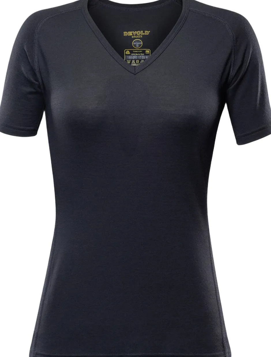 Devold Breeze Tee V-Neck er en lækker T-shirt til kvinder. Den fungerer om sommeren som en funktionel T-shirt til vandrebrug og i vinterhalvåret som et ekstra lunt lag du kan bruge til hverdag på et vinterkoldt kontor eller til aktivt under ski-tøjet eller til vinterløb.