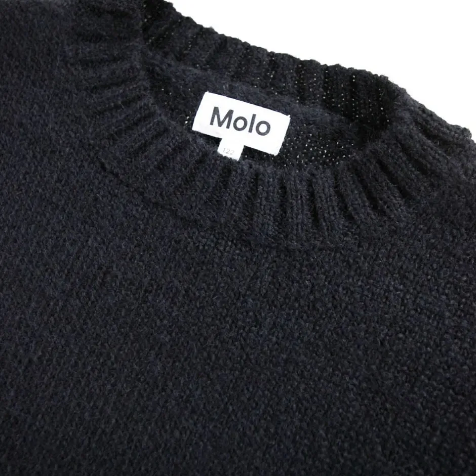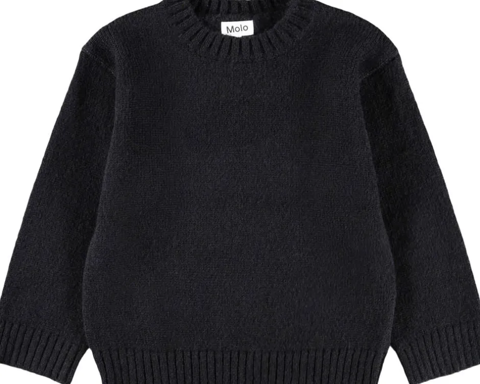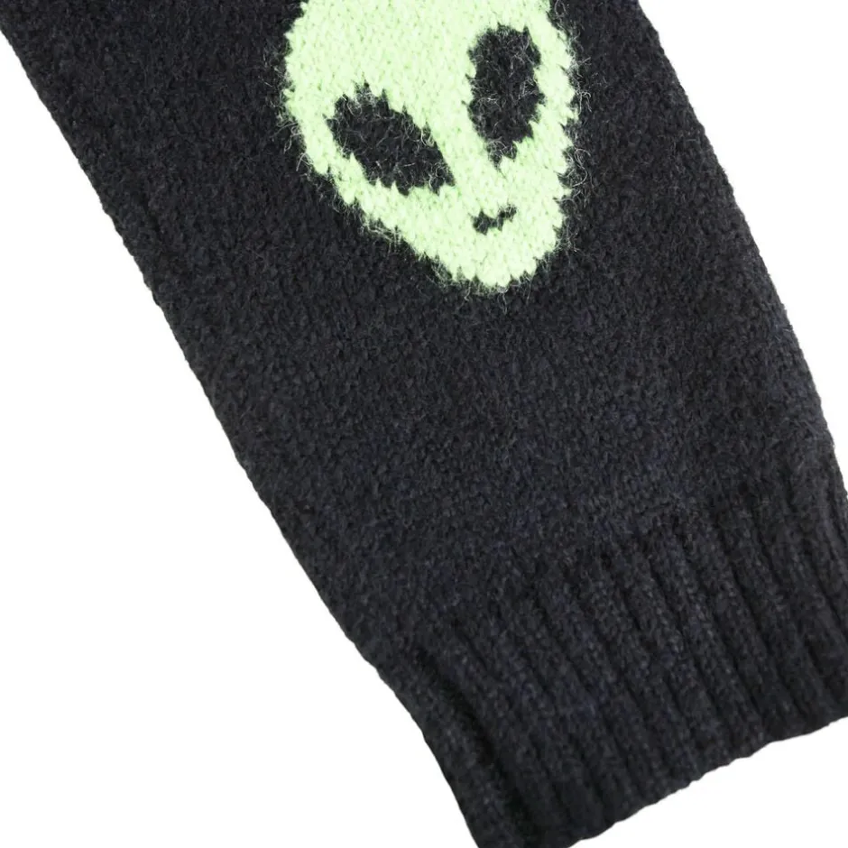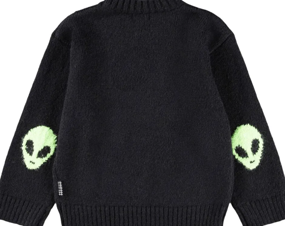 Denne sorte striktrøje fra Molo er lavet i en blød alpaka-uldblanding. Trøjen har en sjov detalje med vævede grønne alien på albuerne og ribstrik ved halsudskæringen, ærmerne og hofteområdet. Den har en almindelig pasform.