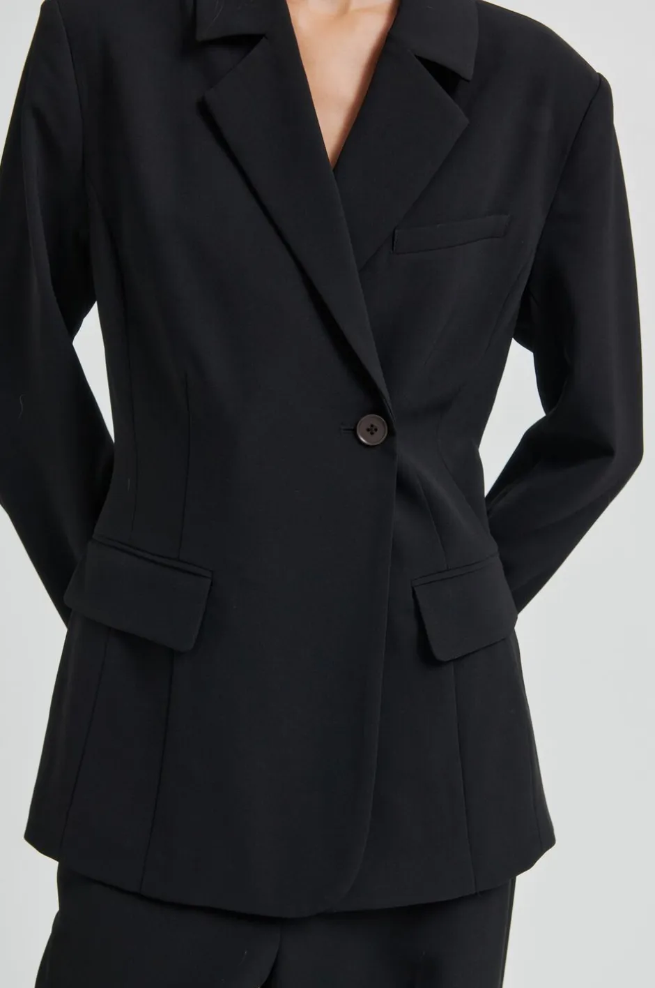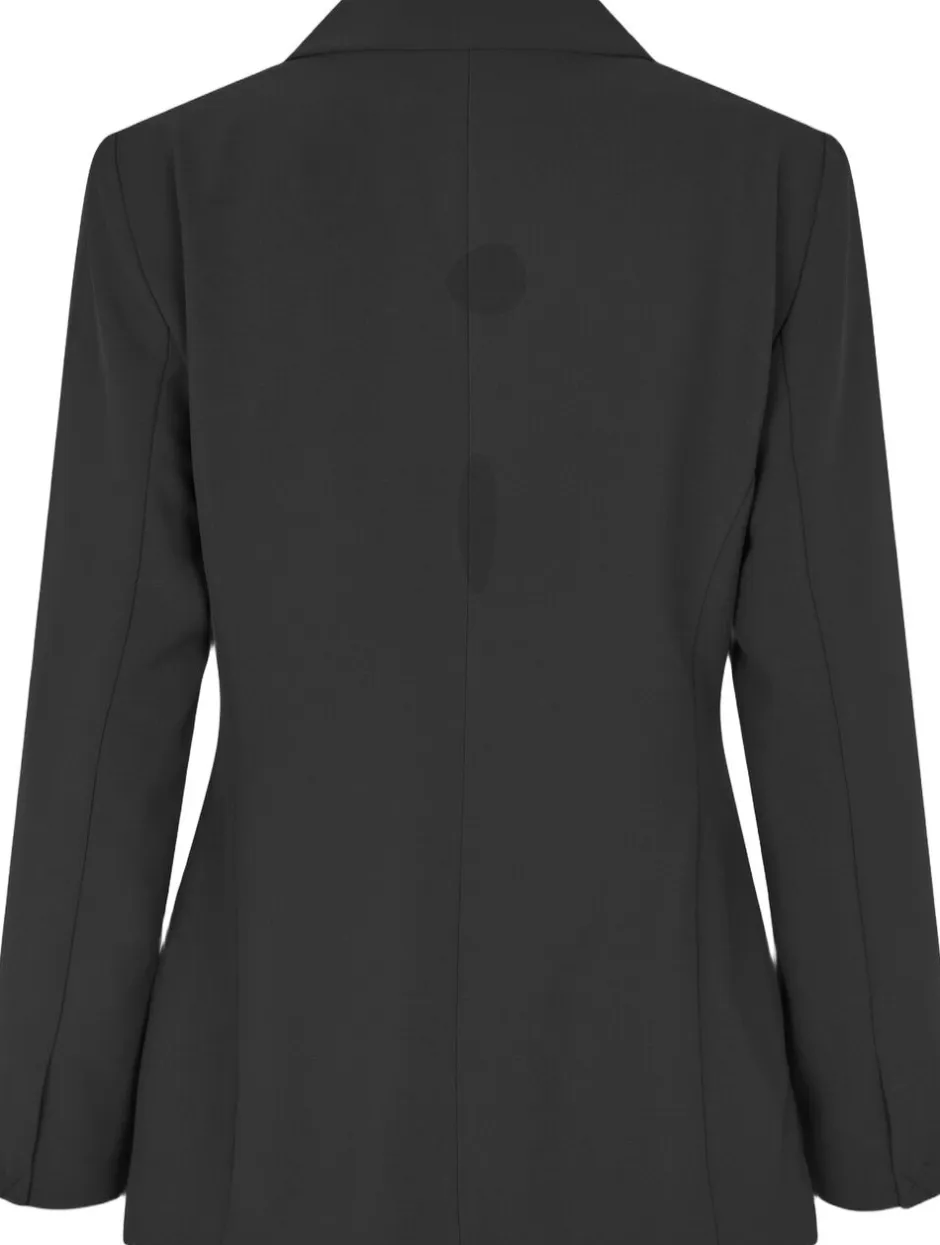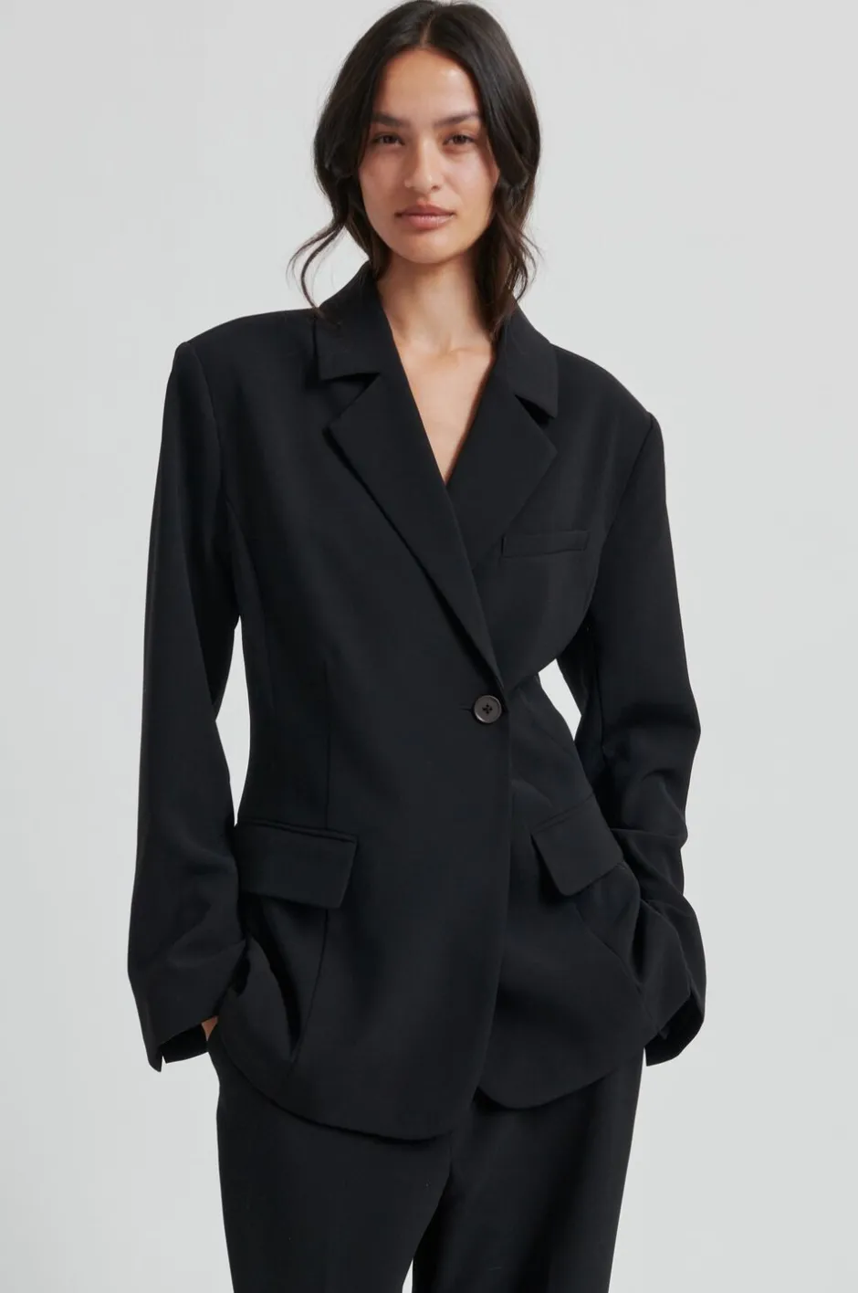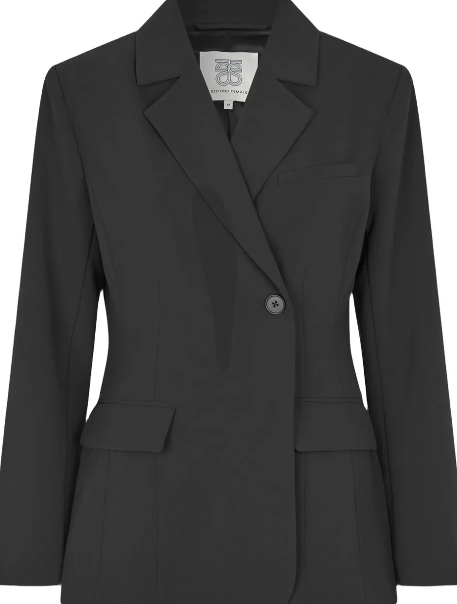 Second Female blazer. Fremstillet i et glat og draperet materiale. Med bredt hakrevers og en enkelt knap foran. Vatterede skuldre og lange ærmer med slids ved manchetterne. Helforet. Figursyede sømme,