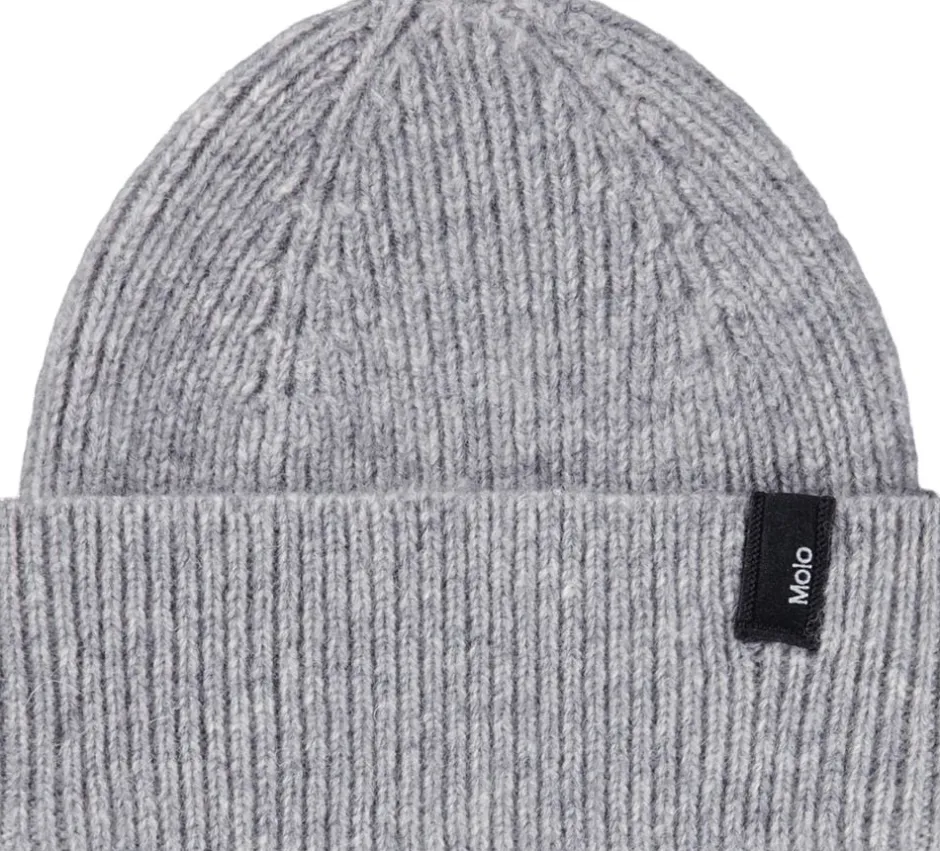 Grå ribstrikket hue i uld fra Molo med ombuk og Molos logo.