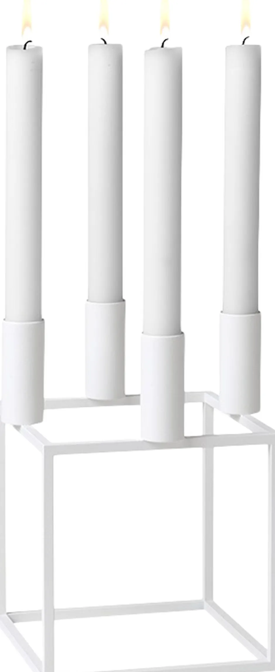 Kubus 4 lysestagen i hvid er fremstillet i støbejern og tegnet af Mogens Lassen i 1962. Lysestagen fås i hvid, sort, bruneret kobber, nikkel samt messing. Med skarp fornemmelse for nutidens funkisstil designede Mogens Lassen i 1962 de ikoniske Kubus lysestager, dengang forbeholdt familien og de nærmeste arkitektvenner. Kubus fremstilles fortsat i Danmark, og har blandt arkitekter og designelskere opnået status som et moderne internationalt designikon. Rengøring: Vend stagen med lyseholderne ned ad, og placer den på en bageplade med bagepapir stående på lyseholderne. Sættes i en 75 grader varm ovn i 15-20 minutter. Stagen tørres herefter af med en fugtig klud. NB! Brug aldrig skarpe genstande eller kogende vand til at rengøre lysestagen med. Vi anbefaler, at du ikke lader lysene brænde helt ned i stagen, da dette kan medføre misfarvning eller skader på lakeringen.