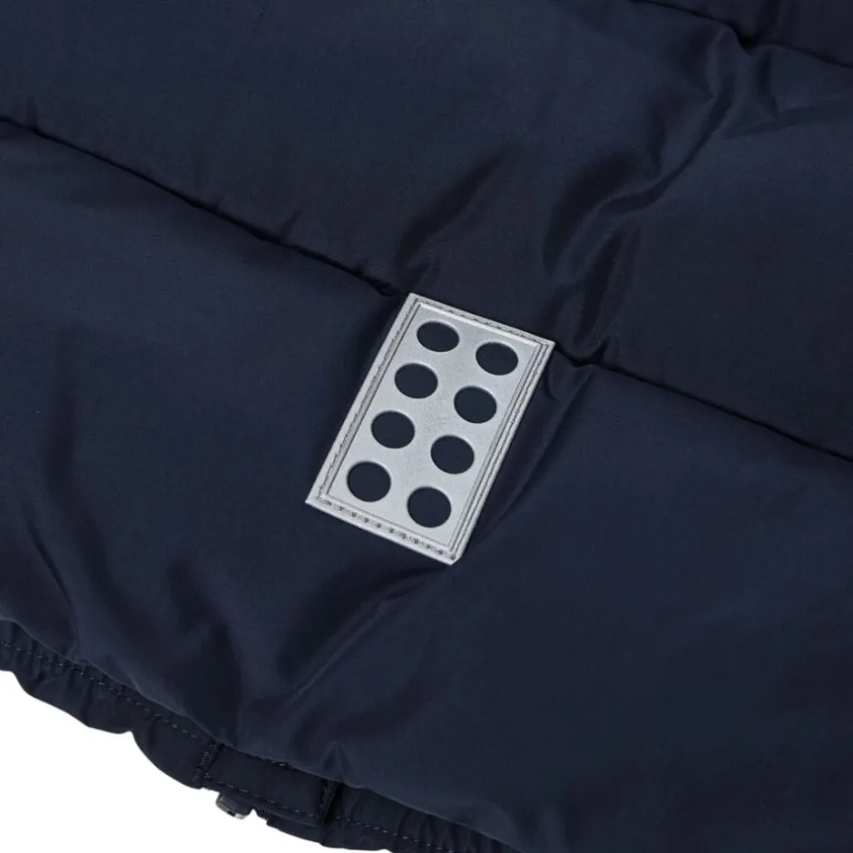 Vesten til børn har et fyld af syntetiske dun, så den er blød og varm at have på. Imprægneringen er vandafvisende, og sammen med refleksen på bagsiden formet som en LEGO klods gør det, at vesten er god til eventyr og leg både ude og inde.