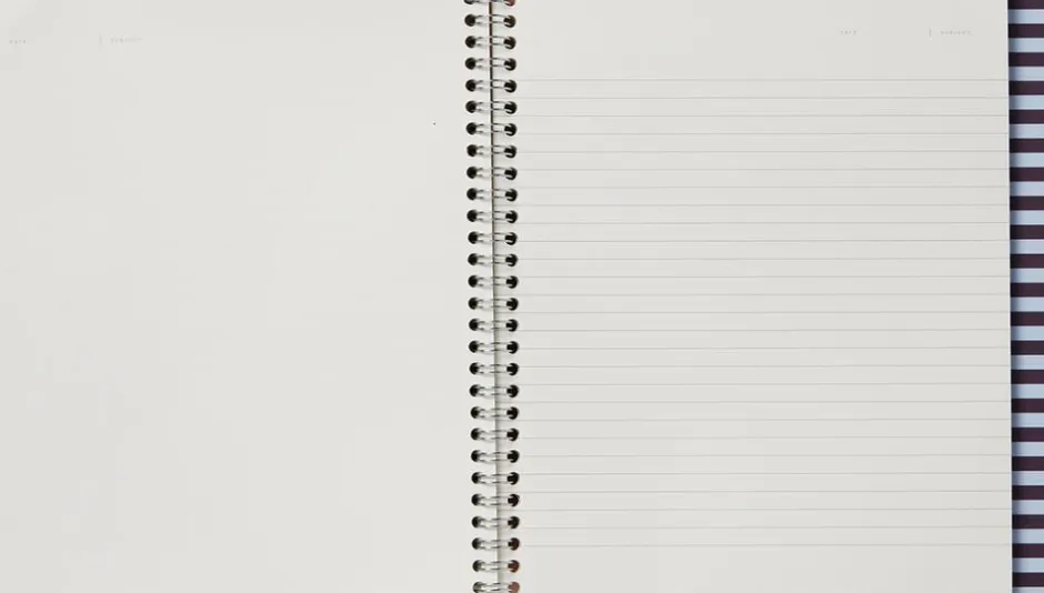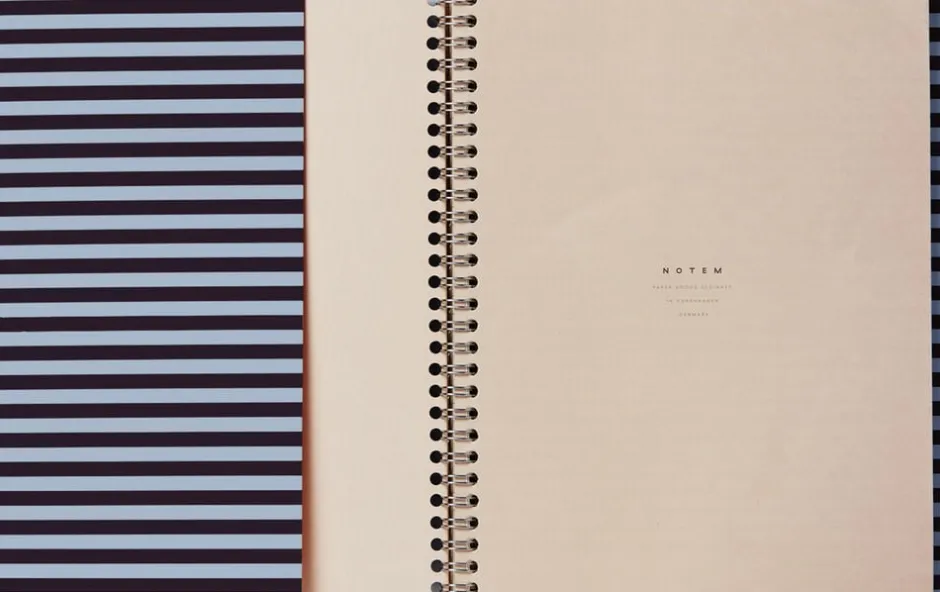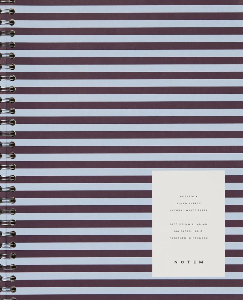 Softcover notesbog fra Notem Studio. Bogen er bundet med spiralryg. Indhold: 160 sider, Linjer på all. Farve: Bordeaux og blå. Mål: 185 x 240 mm. Designet i Danmark.