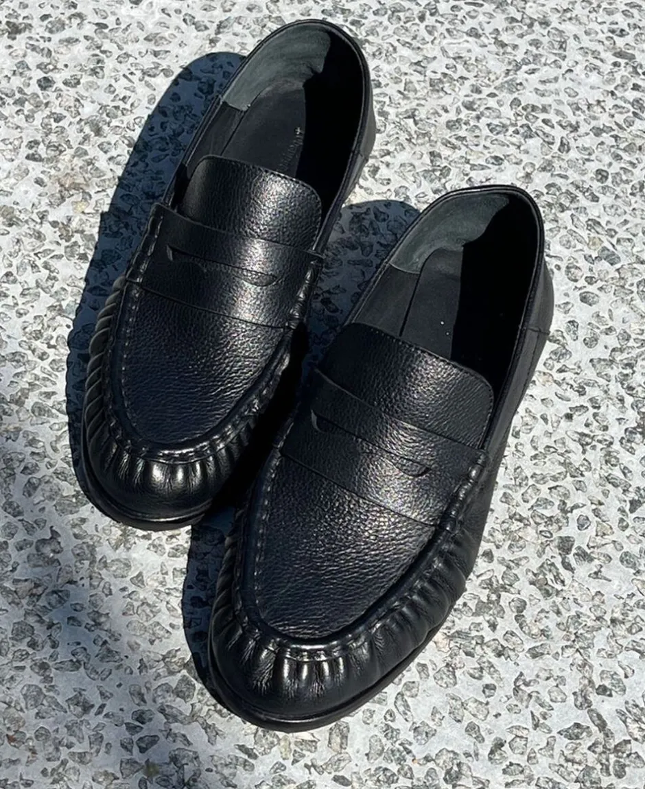 En moderne loafer i sort blødt skind med elegante rynkede detaljer, der giver modellen et feminint og unikt udtryk. Den glatte penny-strap på vristen fuldender det stilrene design, som både er klassisk og trendy. Den fleksible og slidstærke TPU-sål kombineret med den bløde Copenhagenshoes foam indersål sikrer komfort hele dagen.