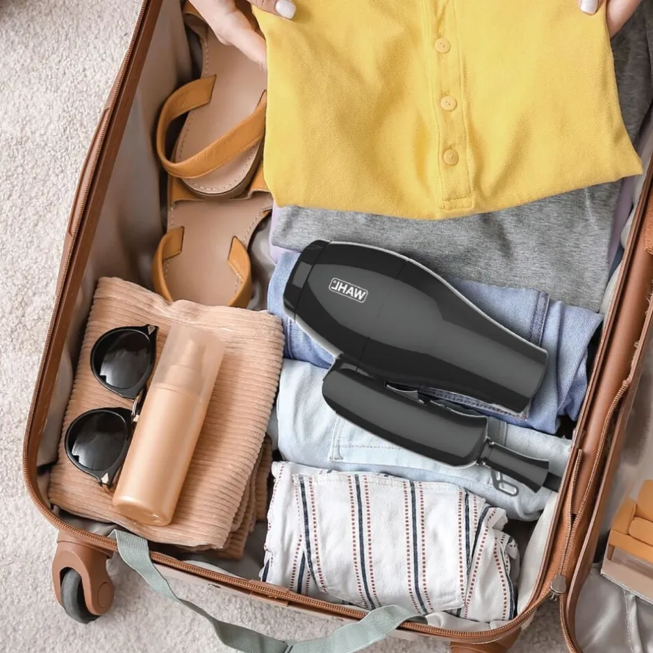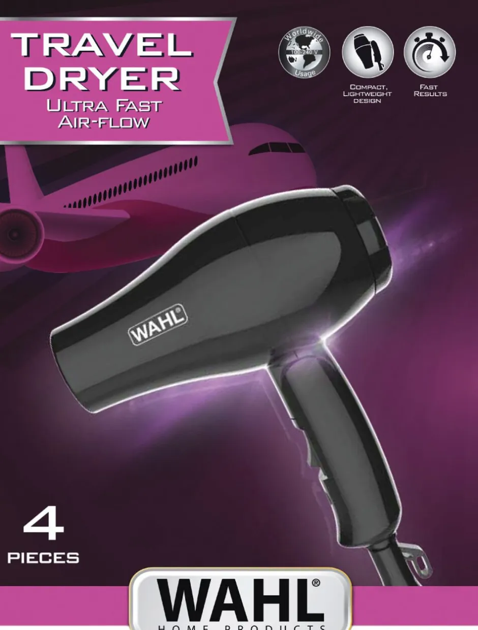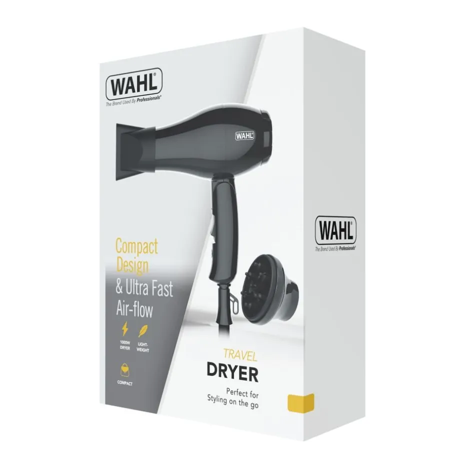 Rejsehårtørrer fraWAHL®. Hårtørreren, der kan bruges i hele verden, er lige til at klappe sammen, så den næsten ingenting fylder i din kuffert. Samtidig vejer rejsehårtørreren fraWAHLmindre end 300 gram, så du behøver heller ikke at bekymre dig om vægten.