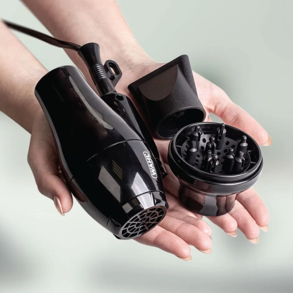 Den krafitigeluftgennemstrømning sørger sammen med 1000wattmotorenfor, at du hurtigt og nemt kan tørre dit hår til trods for hårtørrerens beskedne størrelse. Det aftagelige beskyttelsesfilter gør det nemt for dig at rense din hårtørrer for hår og støv, så den holder længere. Du får både et fønnæb til glat hår og præcisionstørring samt en diffuser til krøllet hår med til rejsehårtørreren fraWAHL.