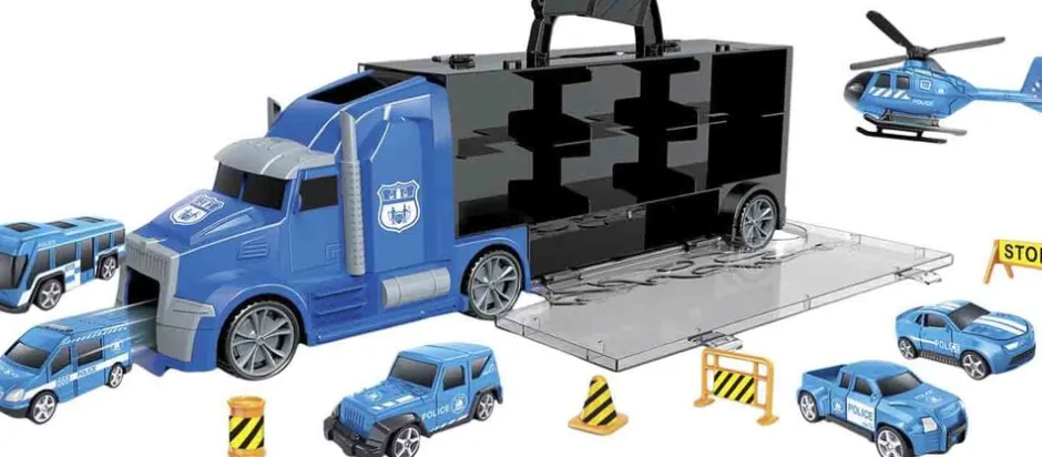 Politiautotransporter med 6 køretøjer og tilbehør I plast Med bærehåndtag og smart funktion, hvor bilerne kan køre ud gennem fronten på lastbilen