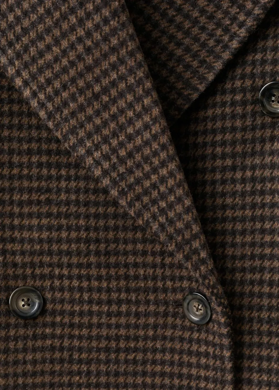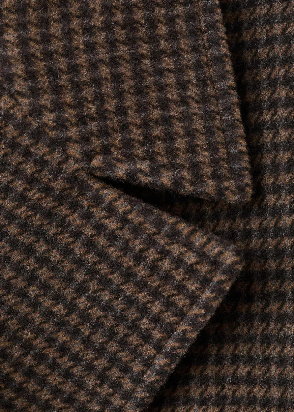 Uldblanding, indvendig foring, oversized Design, langt Design, mikrohanefjedsmønstret tryk, krave med v-hals, revers med hak, lange ærmer, to lommer med kantning i siderne, dobbelt knaplukning.