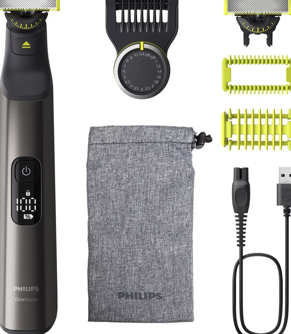 Philips OneBlade Pro Face + Body trimmer, barberer og styler hår i alle længder. Du får et blad til ansigtet og et blad til kroppen, inklusive et hudbeskyttelsestilbehør. Med Philips OneBlade behøver du kun ét værktøj til din stil.