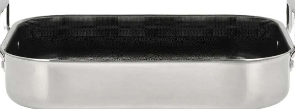 Bradepande, 39 x 26,5 x 10,6 cm. Paillon Hybrid-serien fra Pillivuyt Gourmet er fremstillet i 3-ply rustfrit stål, som er en konstruktion af to lag rustfrit stål med et aluminiumlag imellem. Det betyder, at varmen fordeles hurtigt og fastholdes jævnt. Takket være den indvendige keramiske hybridbelægning får du en slidstærk overflade med en effektiv non-stick-effekt. Det forhøjede mønster i rustfrit stål beskytter bunden, mens den keramiske topbelægning sikrer, at maden ikke brænder fast. Kort fortalt: Fremstillet i 3-ply rustfrit stål Keramisk hybridbelægning på indersiden Poleret rustfrit stål på ydersiden Velegnet til alle varmekilder også induktion Tåler alle redskaber, men vi anbefaler træ, plast eller silikone Tåler ovn op til 240 °C (gryder dog uden låg) Håndopvask anbefales Produceret uden PFAS