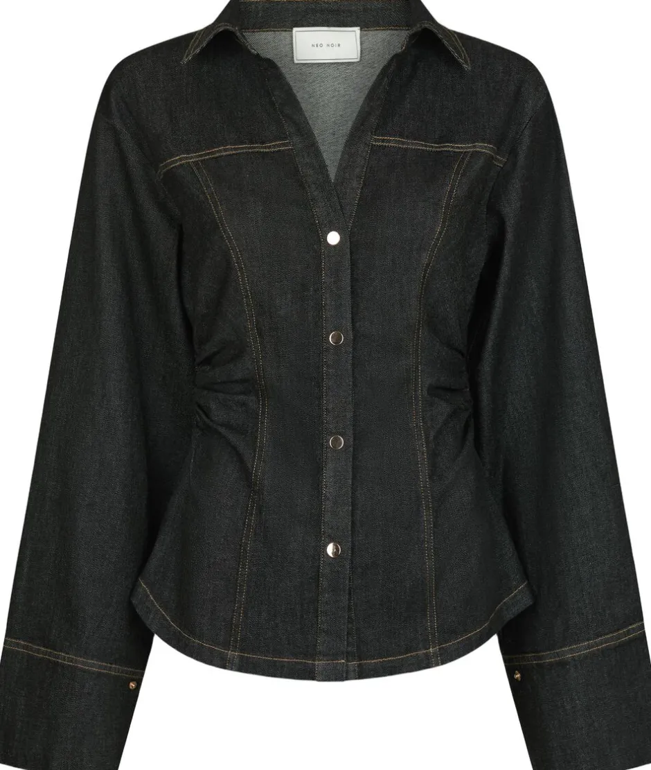 Denimskjorte med kontrastsyninger. Skjorten har en V-udskæring med krave, lange ærmer med brede manchetter og lommer foran. Den er lavet i en blød og strækbar denimkvalitet. Pasformen er tætsiddende, og modellen er iført størrelse 36.