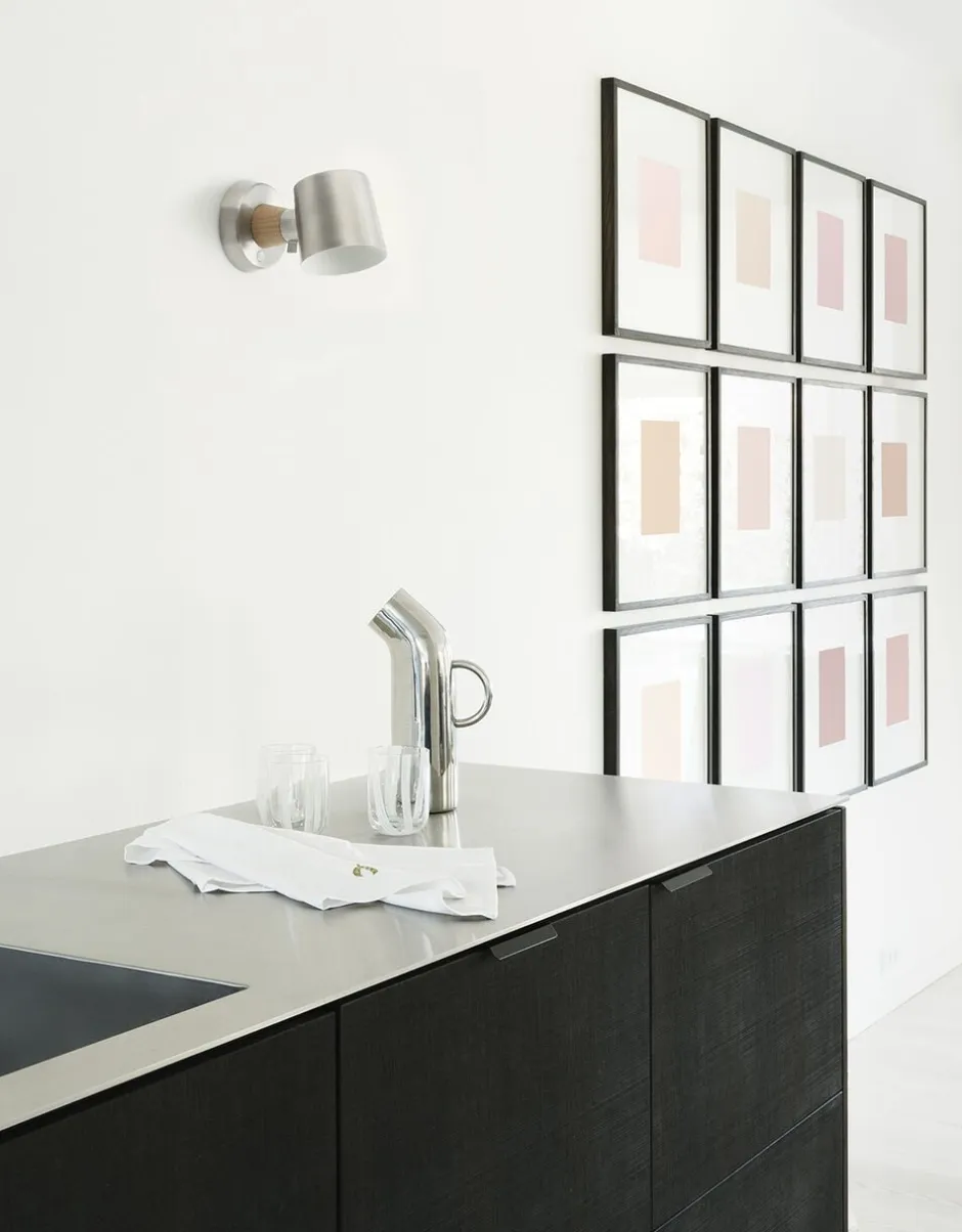 Rise væglampen består af en base og en cylindrisk skærm, der holdes sammen af et vinkelled, således lampen kan drejes 350 grader. Skærmen har en perforeret hvid inderside for optimal lyseffekt. Rise fås enten med tilslutning til stikkontakt eller indfræsning i væggen.