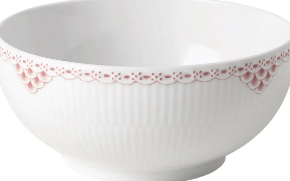 Skålen i Koral Riflet Blonde er perfekt til dit spisebord eller køkkenbord, fyldt med friske farverige frugter. Blondedekorationerne er håndmalet i den bløde, men livlige koralnuance, hvilket gør det til en charmerende udgave af din eksisterende samling af spisestel.