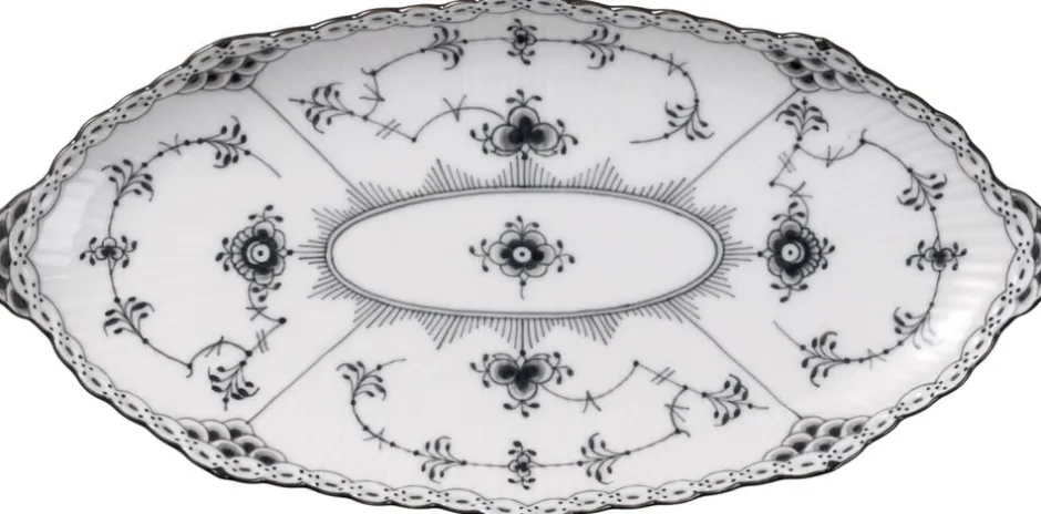 Baseret på en form fra Royal Copenhagens arkiv viser denne ovale asiet smukt den halvblondes forviklinger. Blondekanten følger nænsomt tallerkenens bølgede kant og tværs over overfladen folder det håndmalede blomstermønster sig ud. De elegante sorte dekorationer gør dette til et fantastisk og sofistikeret stykke porcelæn.