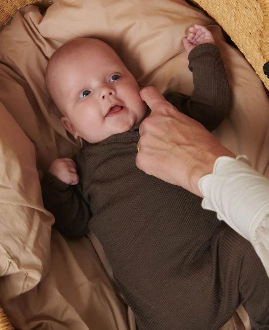 Langærmet heldragt med fødder til nyfødte. Heldragten har slå-om-lukning og lukkes med trykknapper og bindebånd