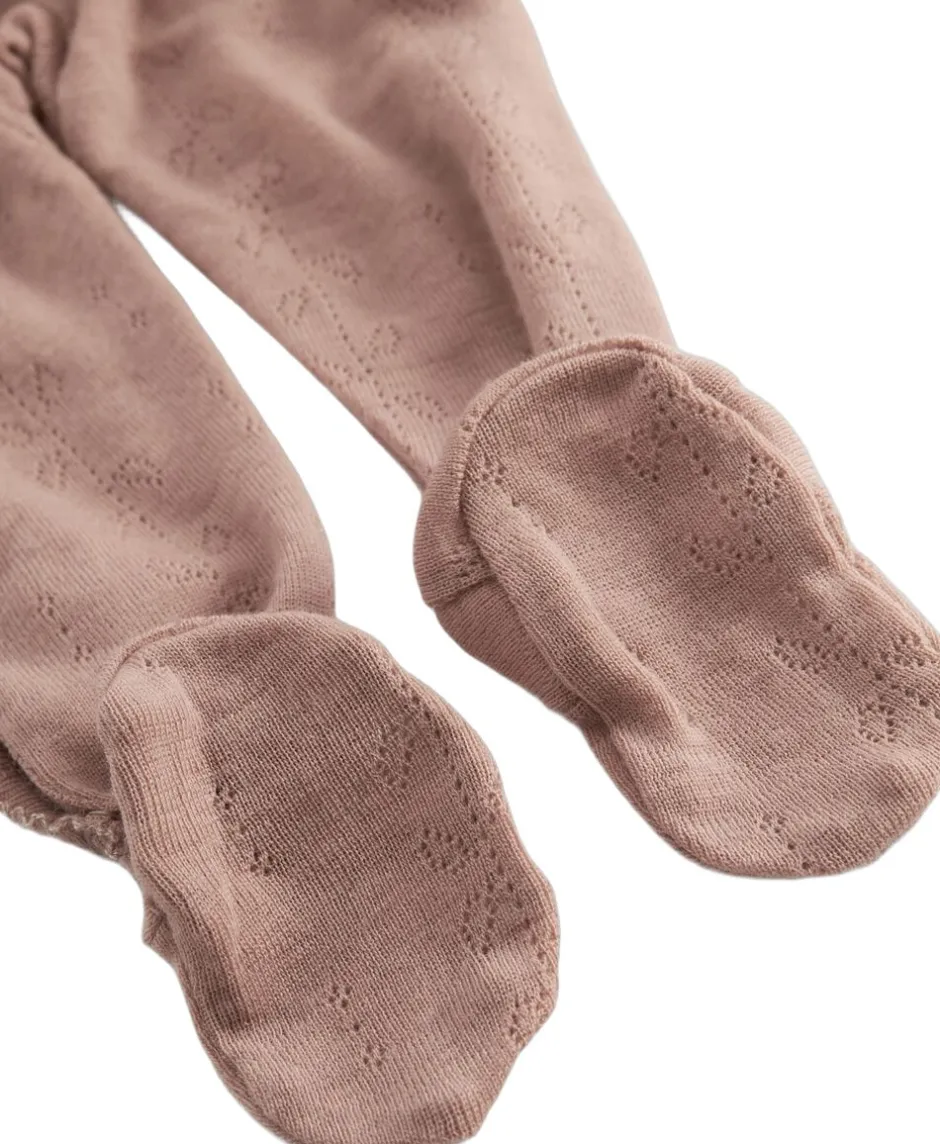 Langærmet heldragt med fødder til nyfødte. Heldragten har slå-om-lukning og lukkes med trykknapper og bindebånd
