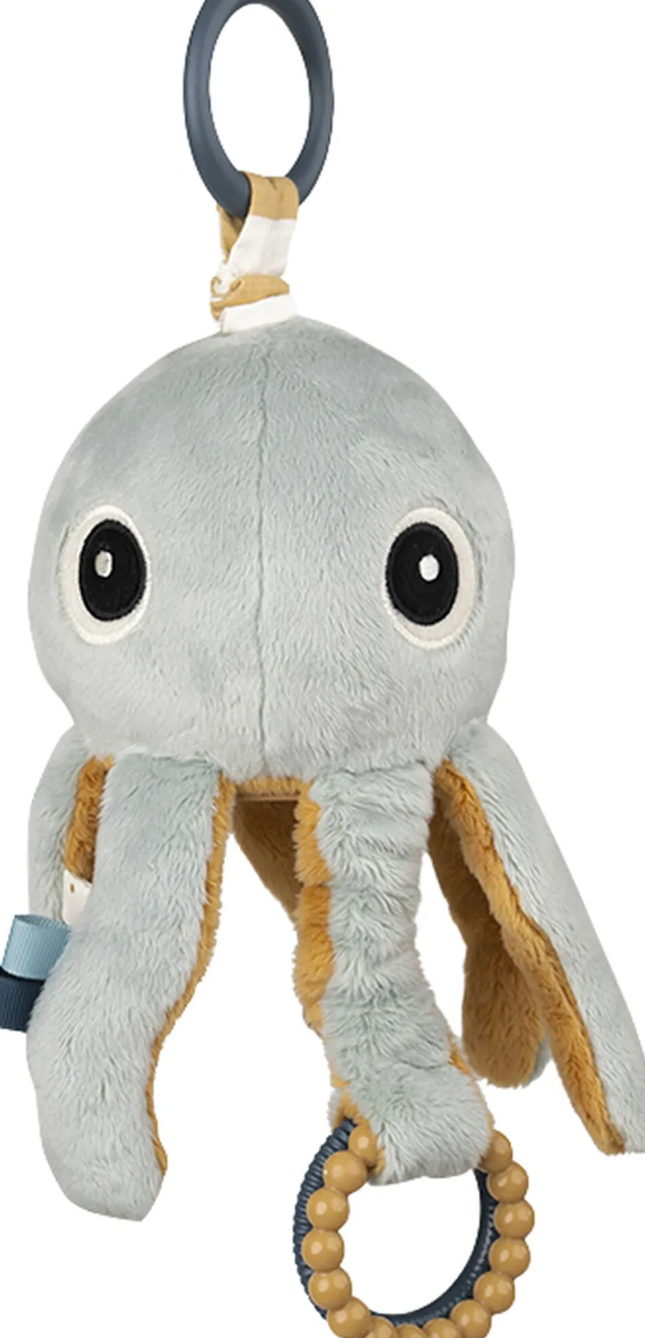Lad nysgerrige øjne og små fingre udforske Jellys mange sensoriske muligheder. Grib fat i Jellys bløde arme, og hør dem knitre eller træk i legetøjs-ringen øverst og mærk Jelly vibrere. Lad de små opdage spejlet, der gemmer sig inde på maven af Jelly. Lad de små få lindring for kløende gummer ved at tygge på ringene, som også giver stimulerende lyde. Små fingre vil elske at udforske de farverige tags, og den søde klokke vil gøre de små nysgerrige. Brug legetøjs-ringen til at fastgøre den søde vandmand til f.eks. en barnevogn, klapvogn, bilsæde eller kravlegård – altid inden for rækkevidde for de små. Aktivitets-Jelly er blød, blå og mustardfarvet. En perfekt gaveide til en aktiv baby.