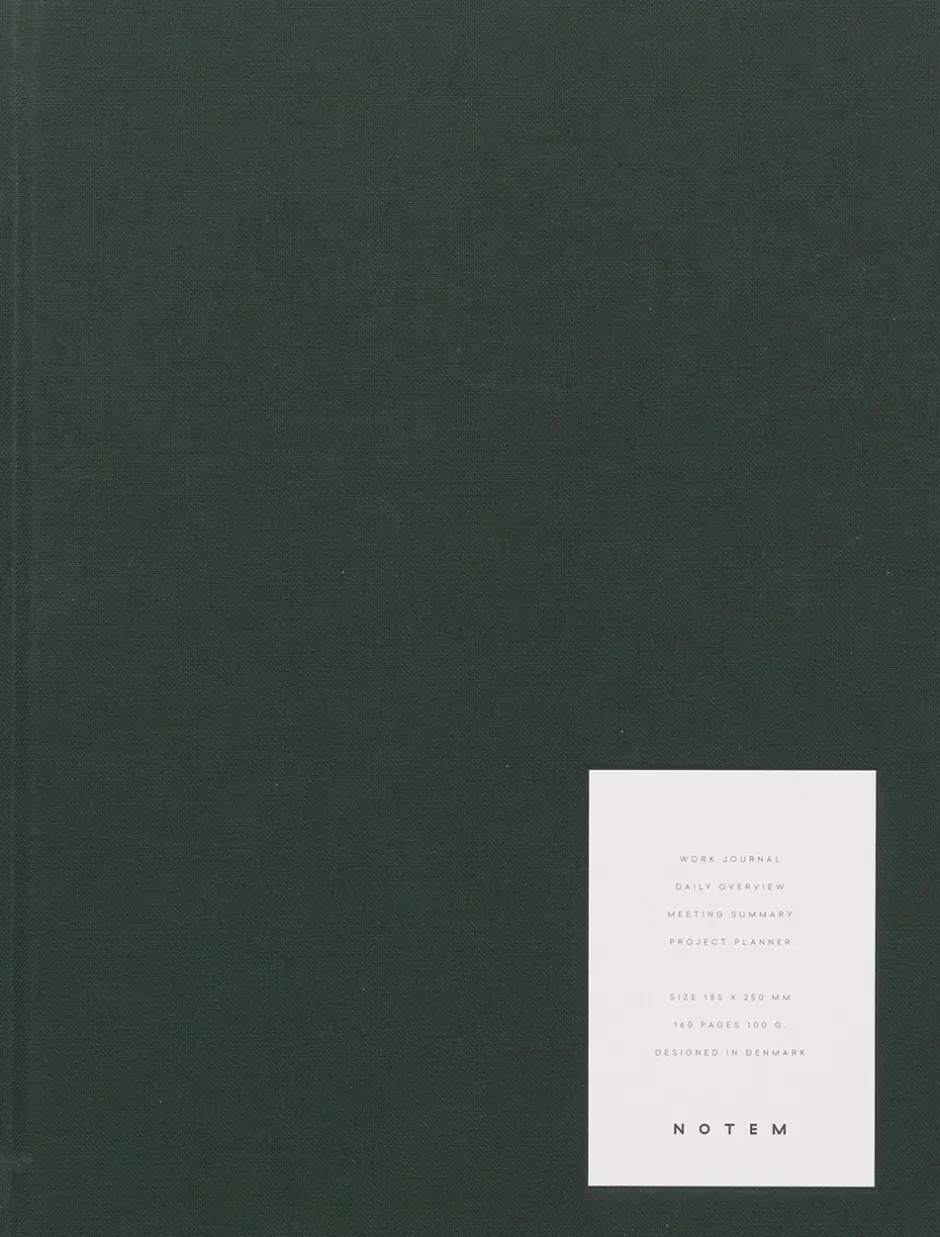 Hardcover notesbog fra Notem Studio med plads til dagsplan, mødenoter, noter, projektplaner mm. Indhold: 160 sider. Bogen er det perfekte suplement til din telefon eller computer på kontoret. Farve: Grønt lærred. Mål: 185 x 250 mm. Designet i Danmark, produceret i Europa.