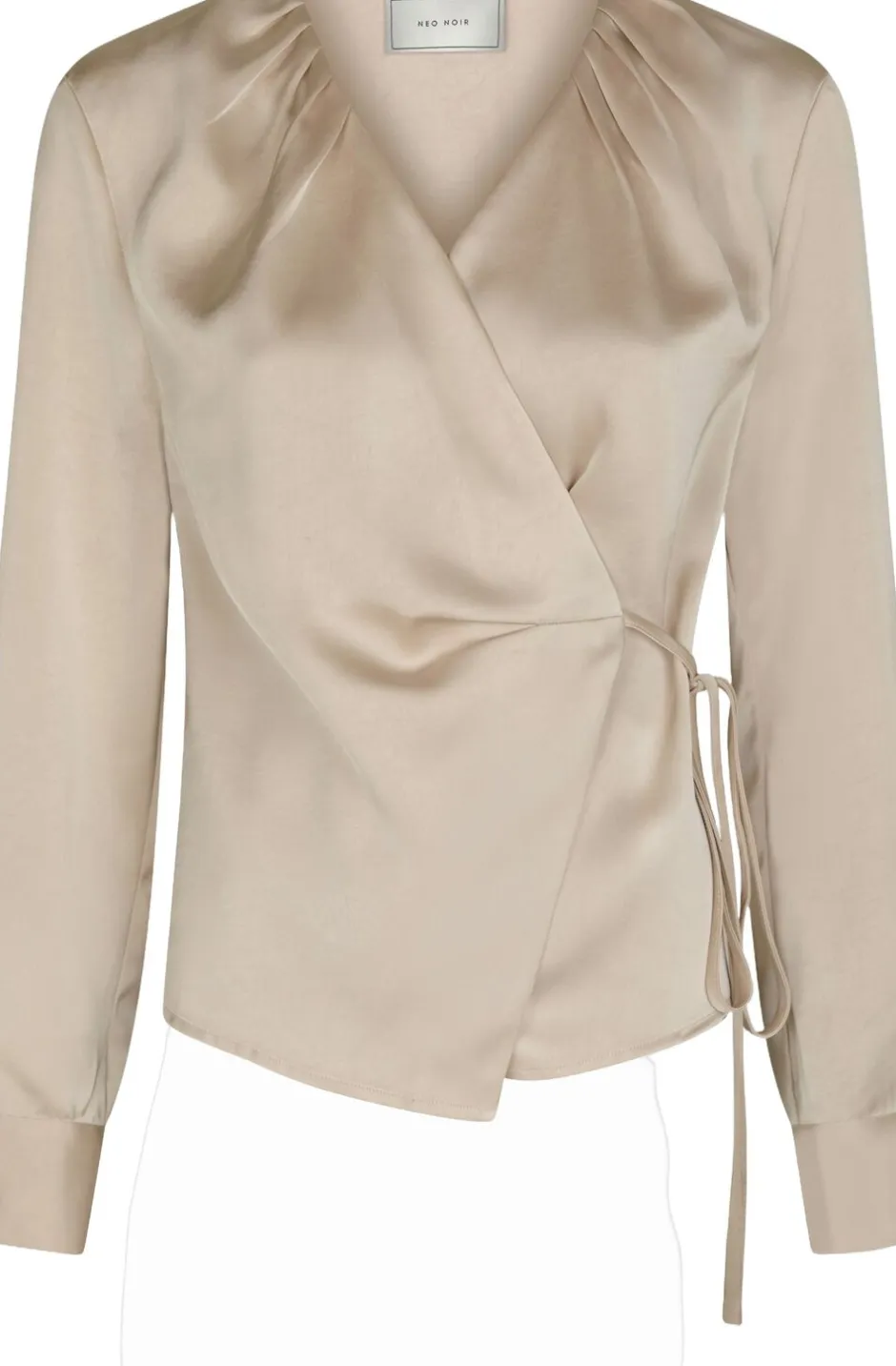 Slå-om-bluse i satin. Blusen har V-udskæring, lange ærmer og tætsiddende manchetter med knaplukning. Den har rynkede detaljer ved halsen og lukkes med et justerbart bindebånd i taljen. Pasformen er almindelig. Modellen er iført størrelse 36.