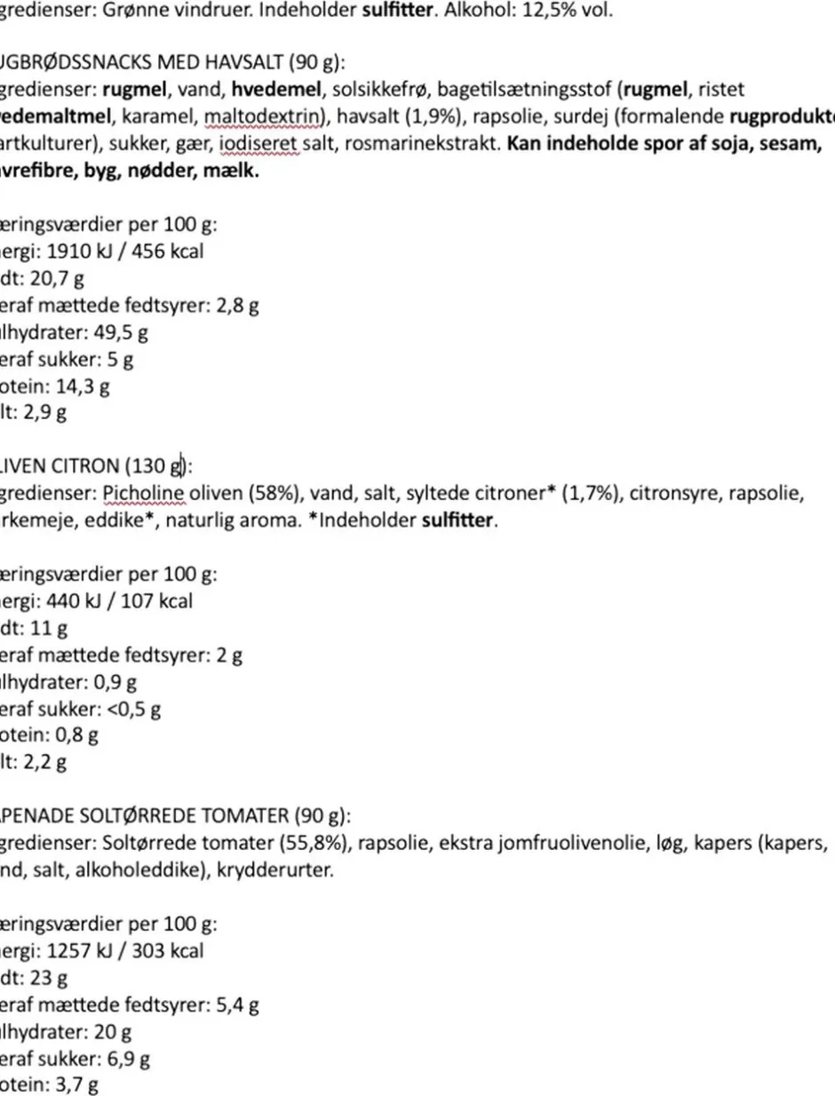 Eksklusiv LIE GOURMET gaveæske til alle som værdsætter en god snack og/eller tapas med et koldt glas hvidvin. Indhold: Hvidvin, rugbrødssnacks med havsalt, oliven med citron og tapenade med soltørrede tomater.
