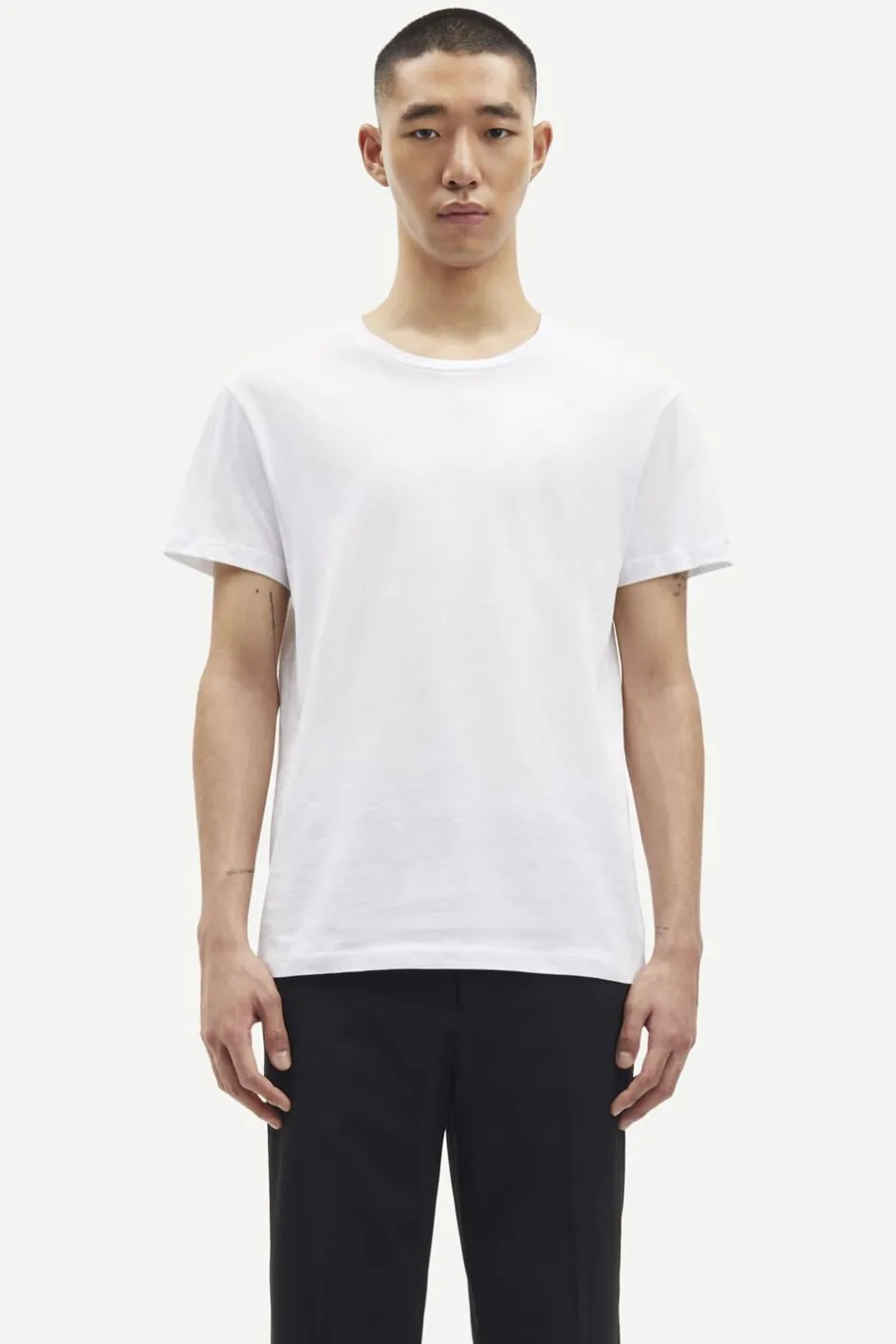 T-shirt med rund hals og en jævn stikning på indersiden i nakken og dobbeltstikninger ved manchetter og kant. En uundværlig basisstyle.