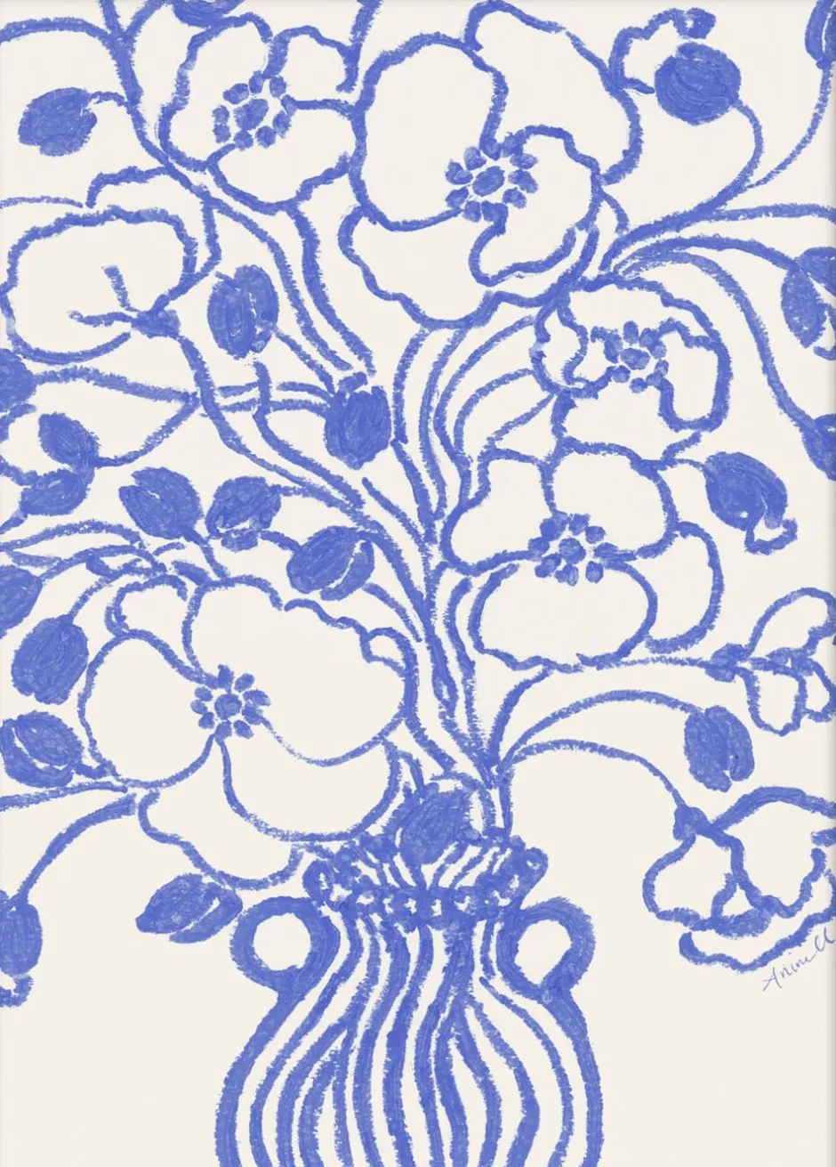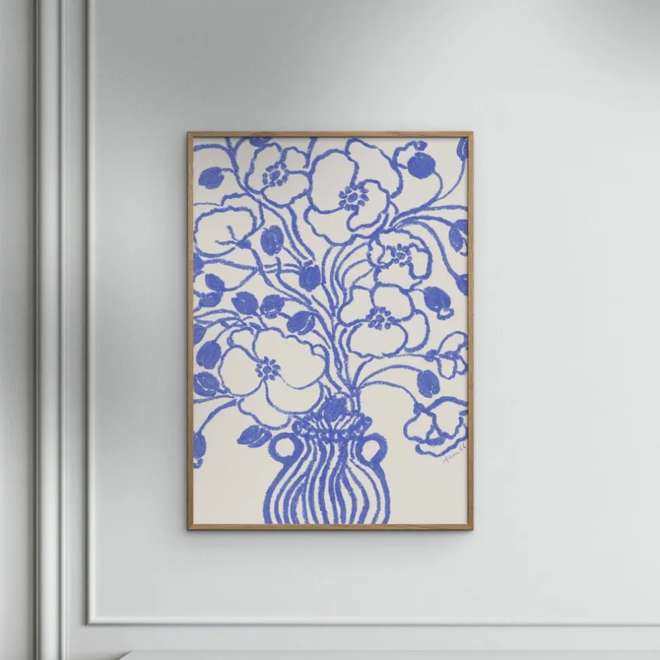 Elegant bl-hvid blomsterillustration, der tilføjer et strejf af klassisk charme og lethed til dit hjem. Perfekt til en tidløs og stilfuld indretning