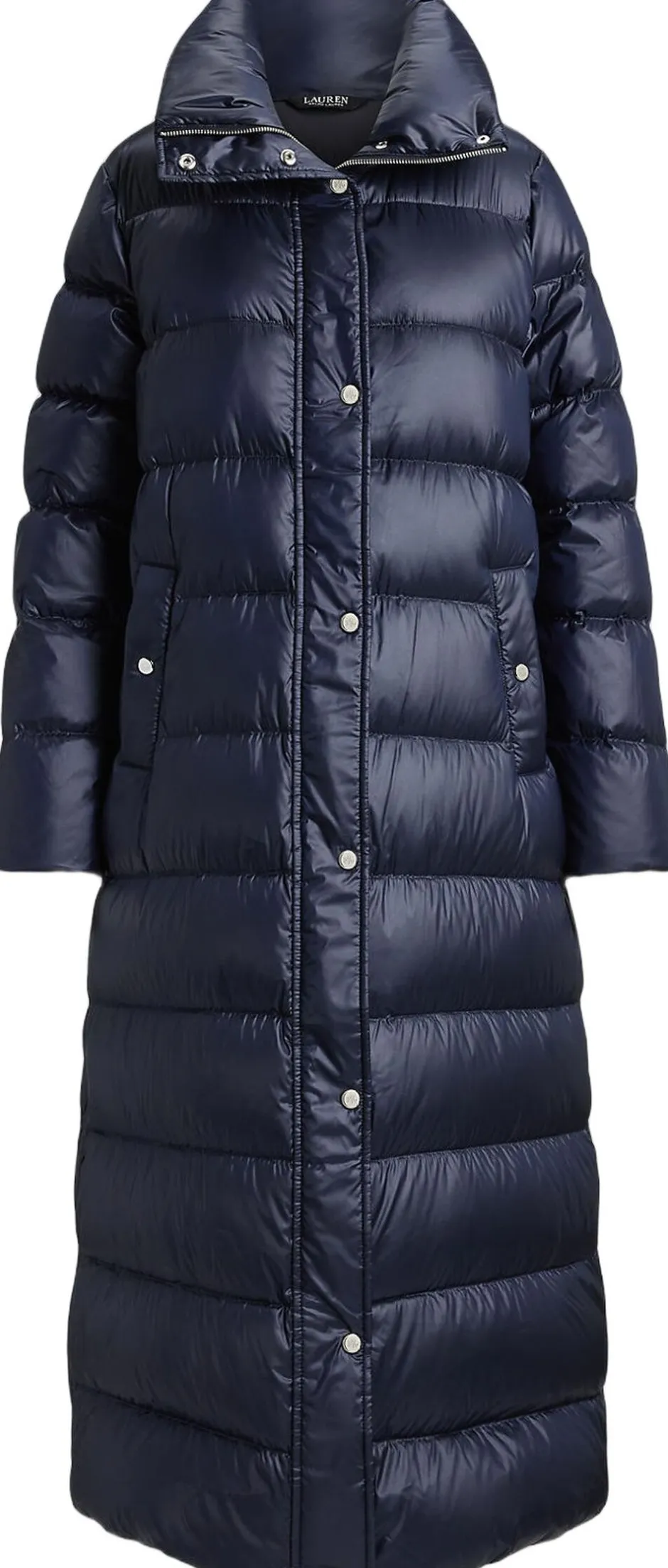 Denne maxi-frakke er fyldt med 650-fyld-dun, har en metallisk finish, en voluminøs skorstenshals og kanalquiltning, hvilket skaber en stil, der er både praktisk og smart