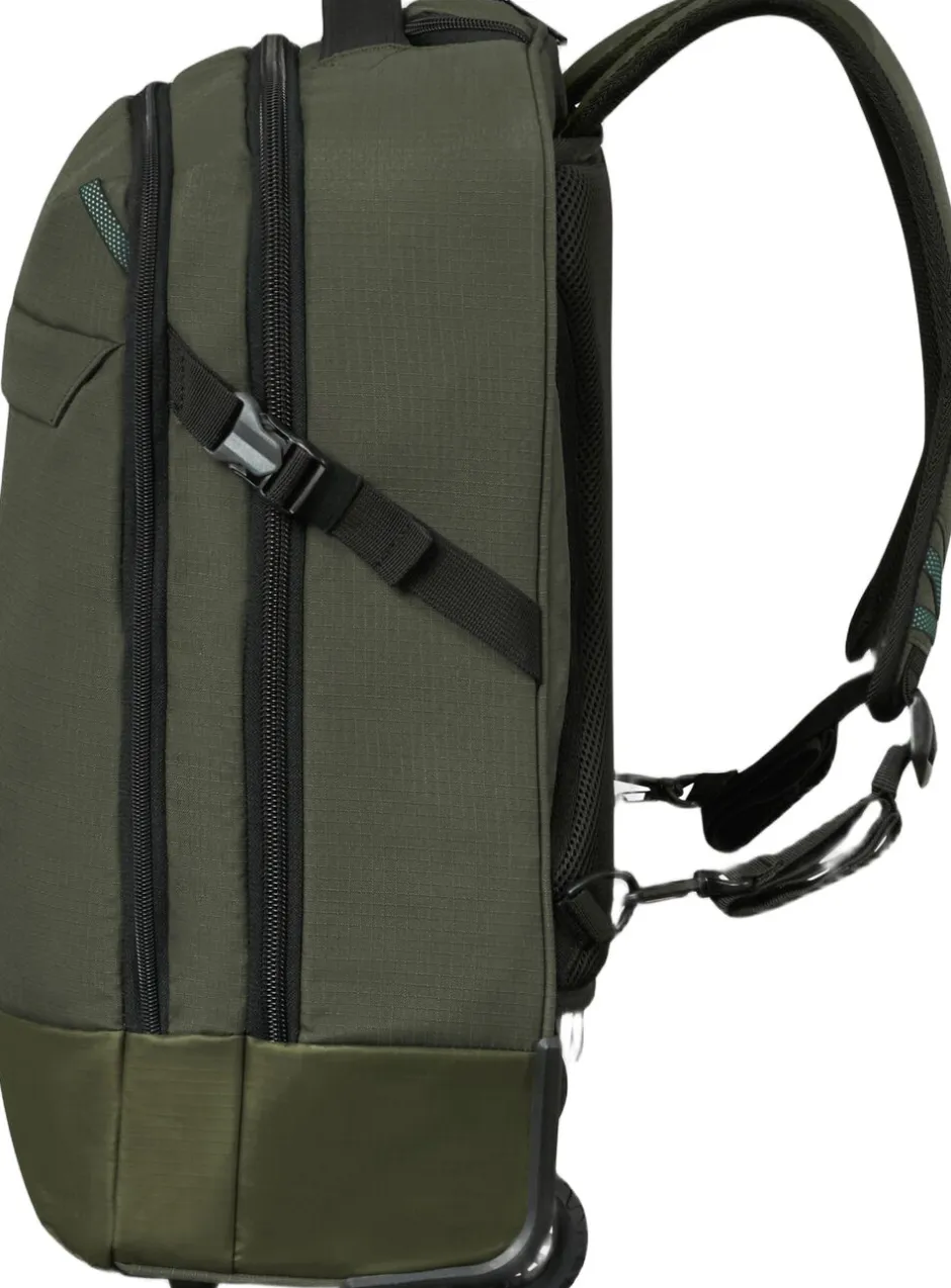 Computer rygsæk med hjul og plads til 17,3″ PC og 10,5″ tablet, både det indvendige og udvendige stof er lavet af genbrugsplast, frontlomme med lynlås, ergonomiske stropper, rumindhold 38 l, vægt 2,1 kg. 5 års garanti.