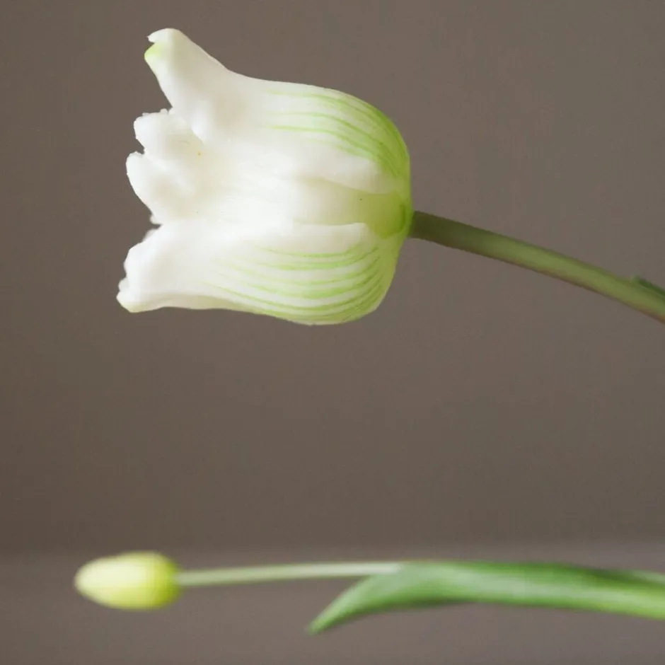 Denne buket viser bløde hvide tulipaner med strejf af grøn, arrangeret for at fremhæve deres elegante, buede kronblade. Den blide kontrast mellem kronbladene og de friske grønne stilke forbedrer sammensætningens naturlige charme. Bomet når en højde på 44 cm på sit højeste punkt, men alle stilke kan let bøjes og justeres for at opnå den ønskede højde og form til ethvert arrangement. Den lille keramiske jordvase på billedet måler 24,5 cm i højden og 8 cm i diameter.