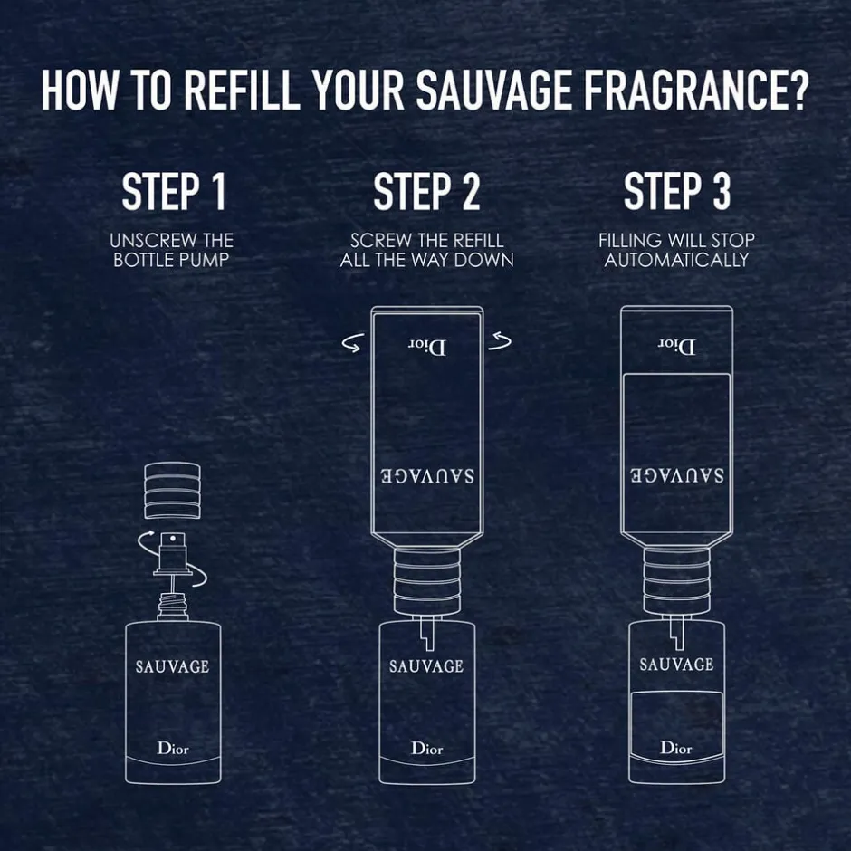 Kan ikke bruges alene. Kun kompatibel med Sauvage Eau de Toilette 30 ml og 100 ml flasker med “”REFILLABLE”” anført på bagsiden (30 ml eau de toilette) eller i bunden (100 ml eau de toilette).