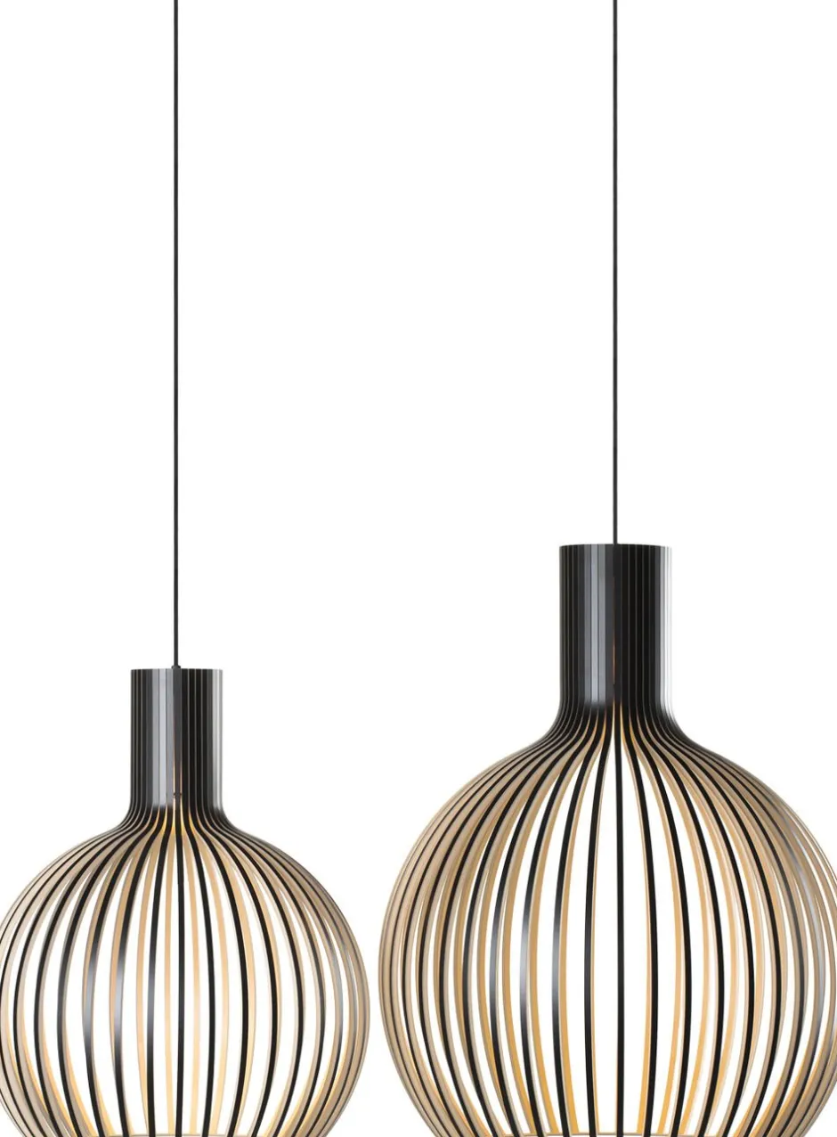 Secto 4241 – den smukke loftslampe fra finske Secto. Lampen er designet af Seppo Koho for Secto design og er kendetegnet ved sin enkelhed og runde form. Lampen er fremstillet i Finland og er lavet af formstøbte birkerør. Secto Octo 4241 fås i fire forskellige farver: Sort, hvid, birk og valnød. Lampen giver et utroligt behageligt og elegant lys, der spredes gennem lampens lameller. Ud over det behagelige lys giver lampen også et nyttigt nedadrettet lys, hvilket gør pendlen perfekt til at hænge over spisebordet. Octo-lampen er en stor lampe, men selve designet får lampen til at virke meget luftig og gør det derfor muligt at bruge lampen i mindre rum. Selvom Secto er et relativt ungt mærke, kan Octo 4241-lampen allerede betragtes som en klassiker.